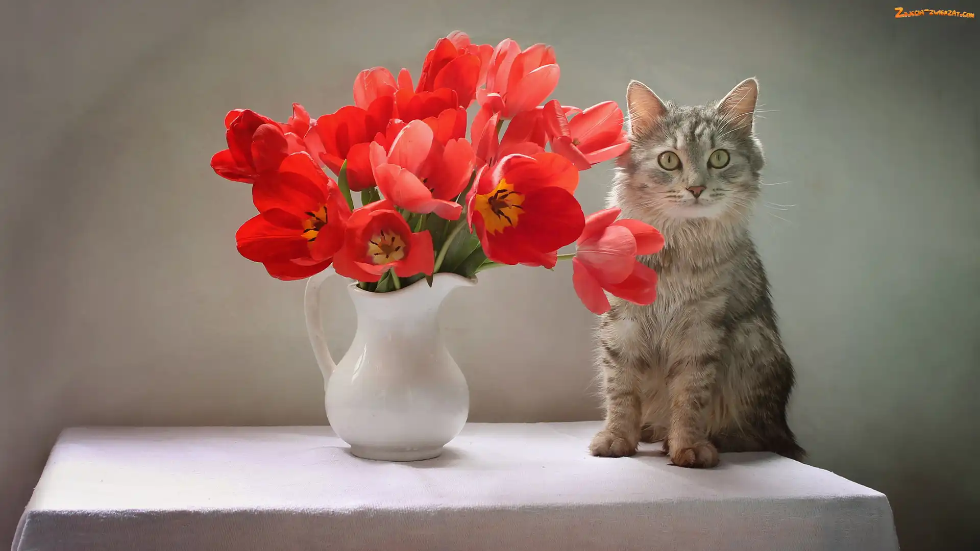 Zdjęcie: Bukiet, Szary, Wazon, Tulipany, Kot, Czerwone
