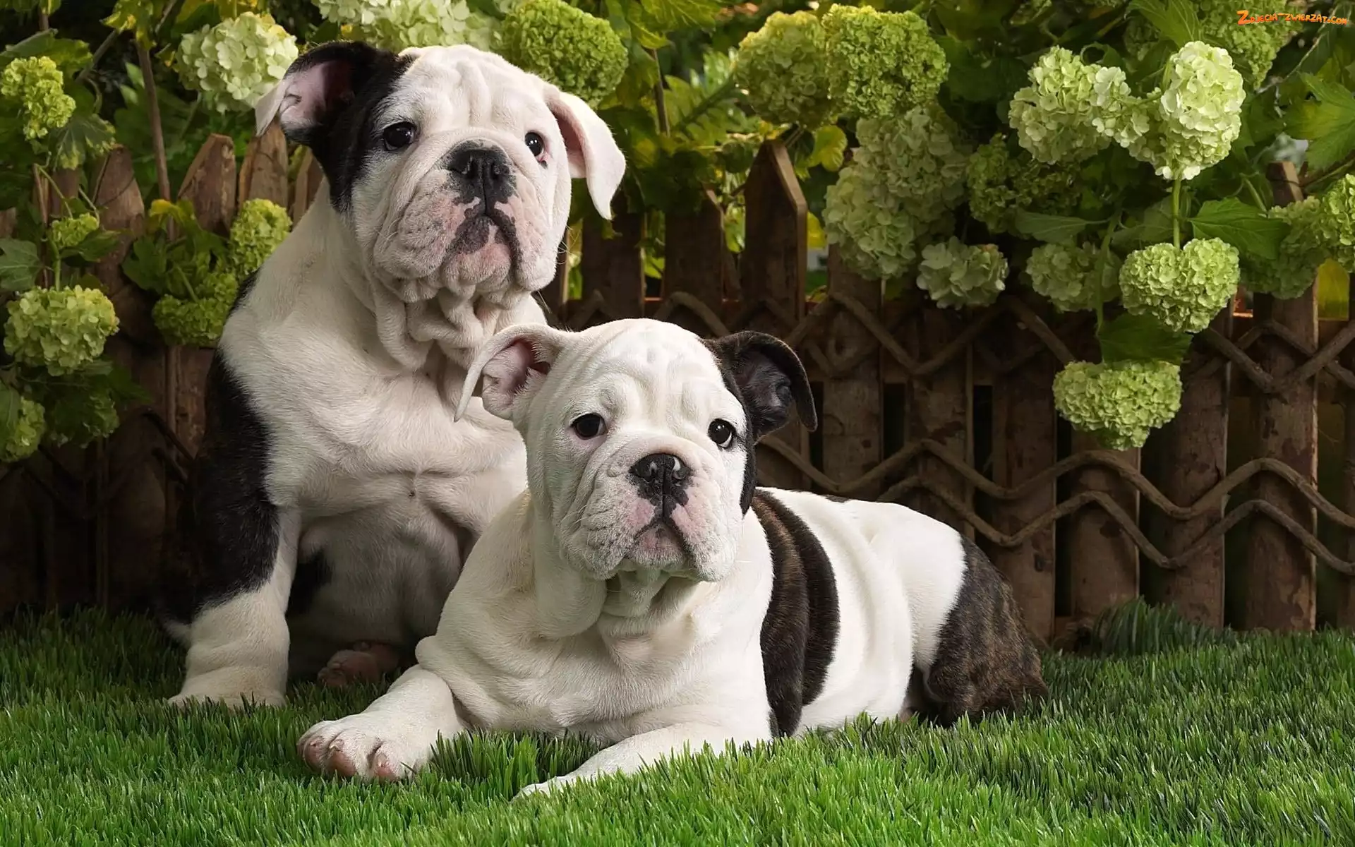 Zdjęcie: Buldogi, Piękne, Trawa, Ogród, Dwa