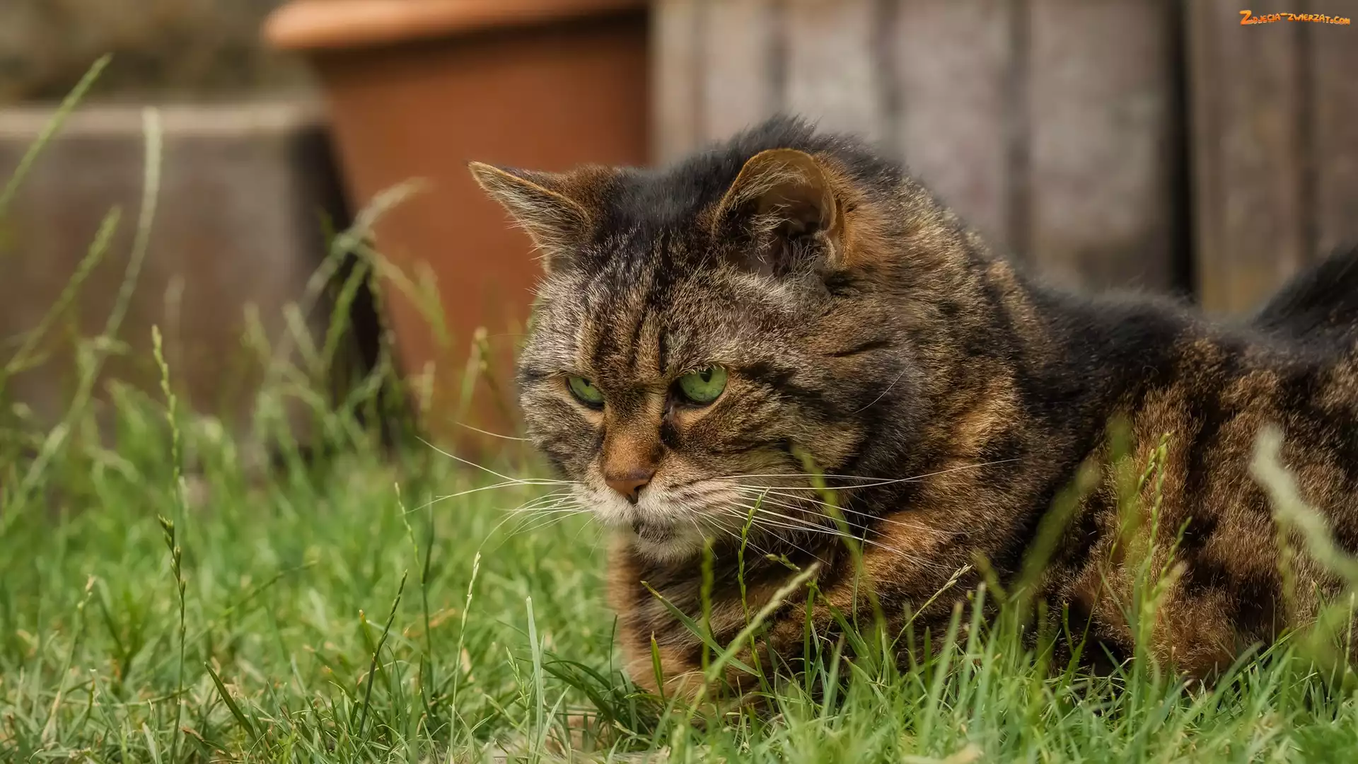 Zdjęcie: Trawa, Kot, Leżący, Bury, Zielone, Oczy