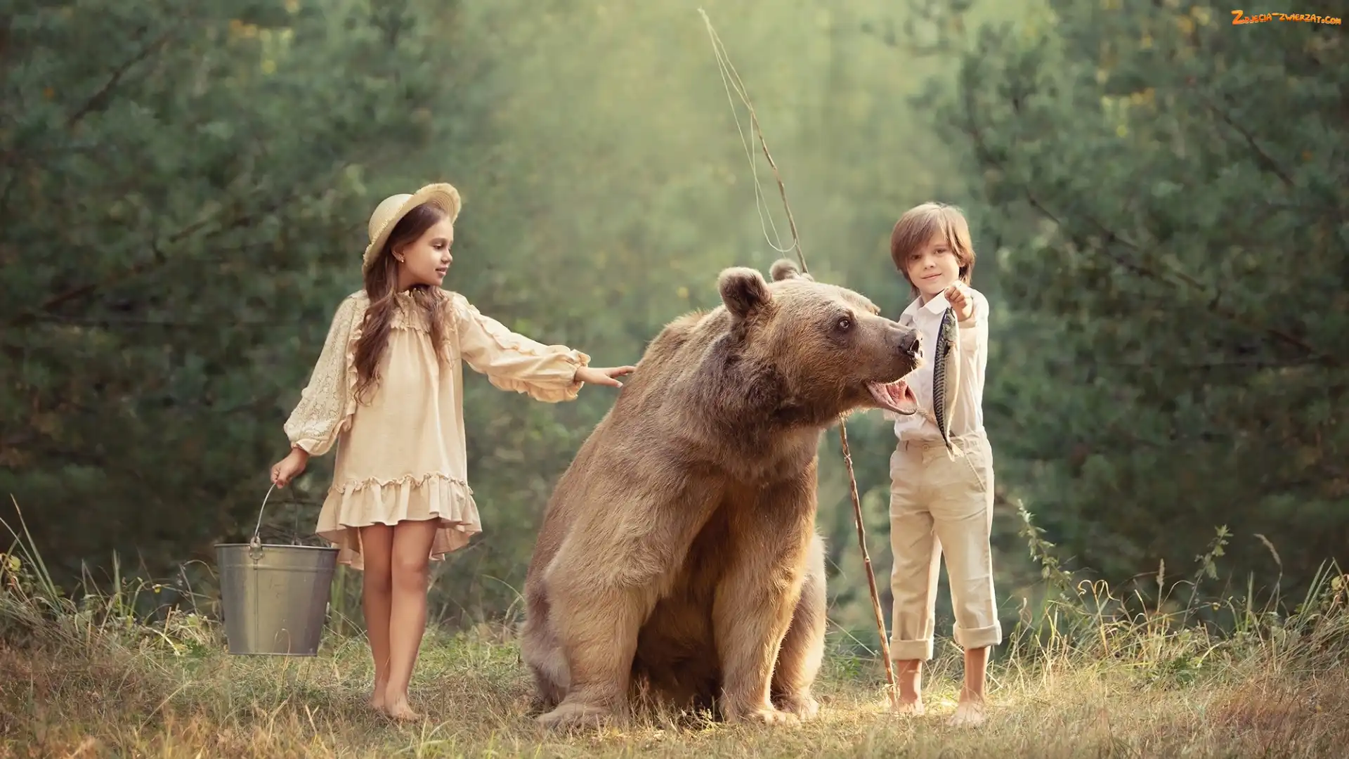 Zdjęcie: Wiaderko, Chłopczyk, Niedźwiedź, Dziewczynka, Kapelusz, Dzieci, Wędka