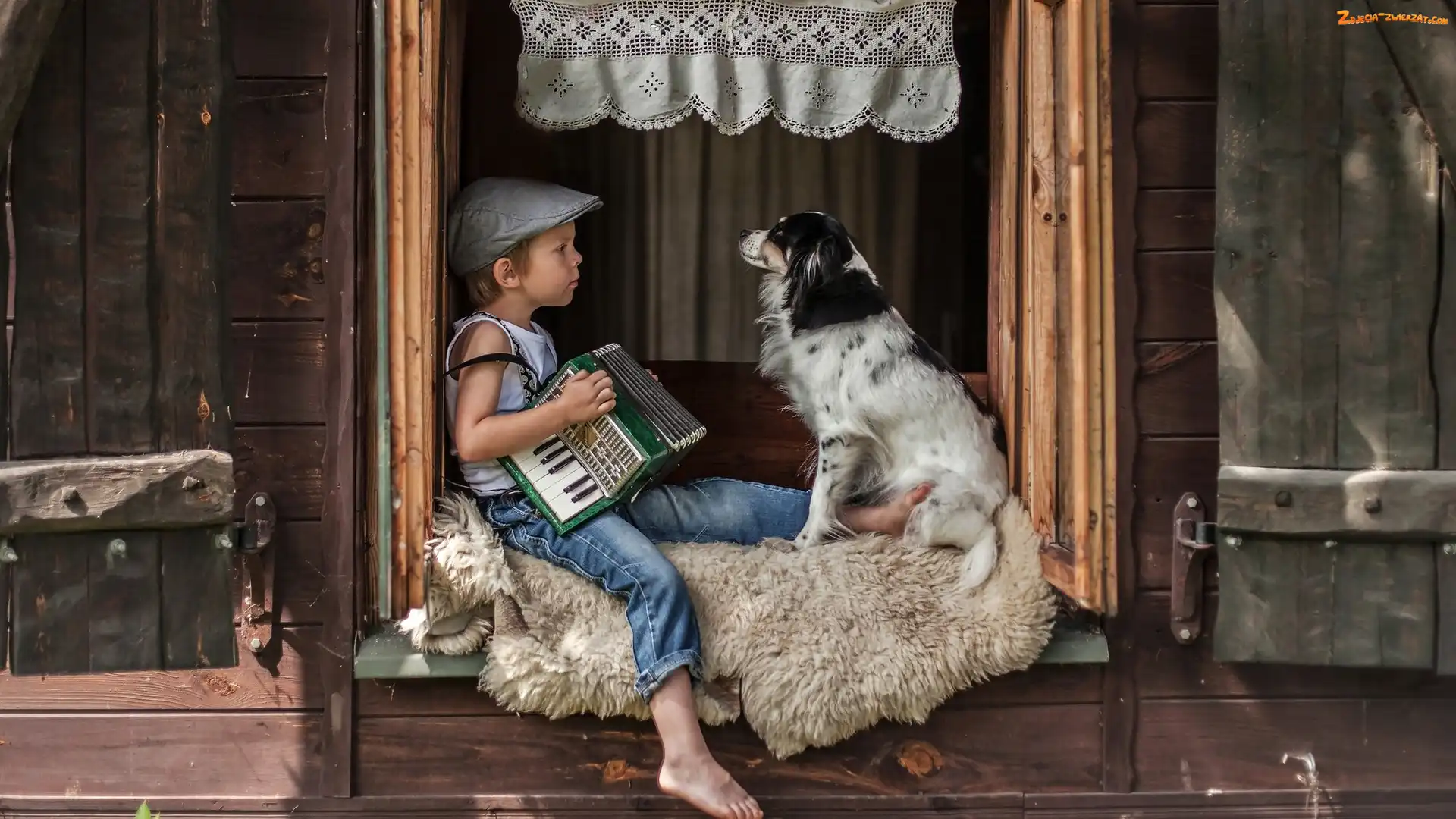 Zdjęcie: Chłopiec, Akordeon, Okno, Pies