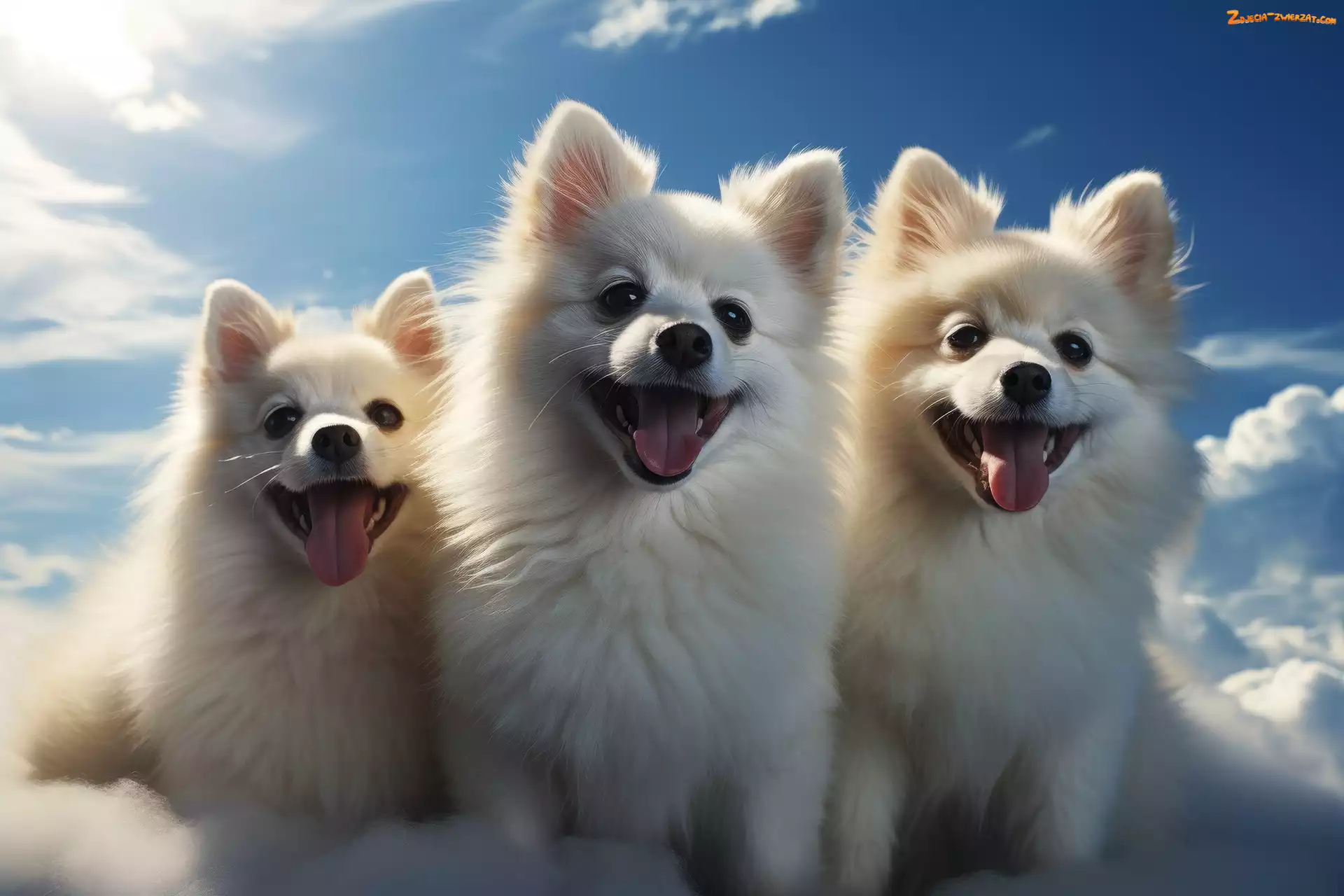 Zdjęcie: Niebo, Trzy, Białe, Szpice miniaturowe, Grafika, Psy, Chmury