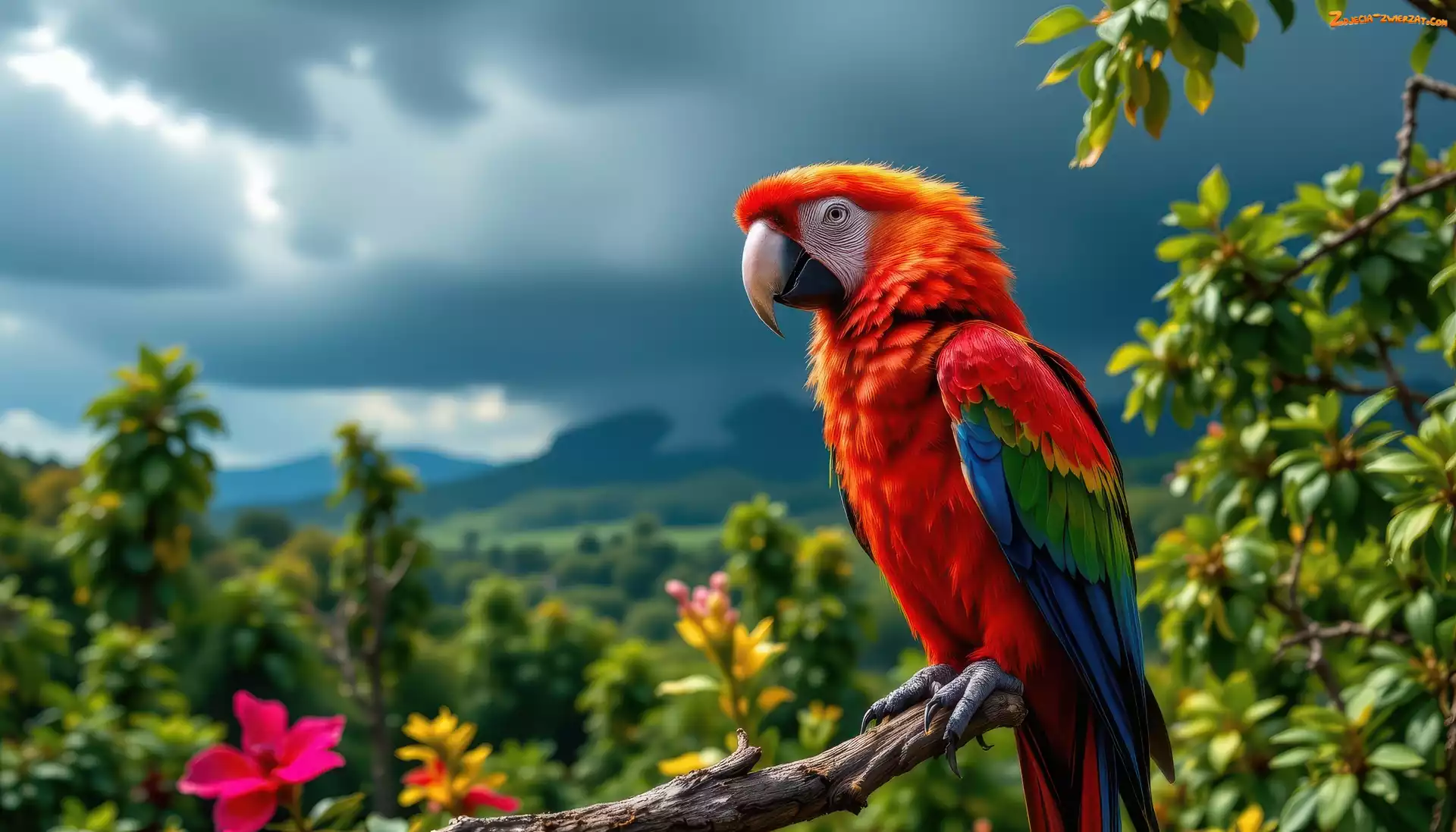 Zdjęcie: Ciemne, Ptak, Papuga, Konar, Grafika AI, Ara, Chmury