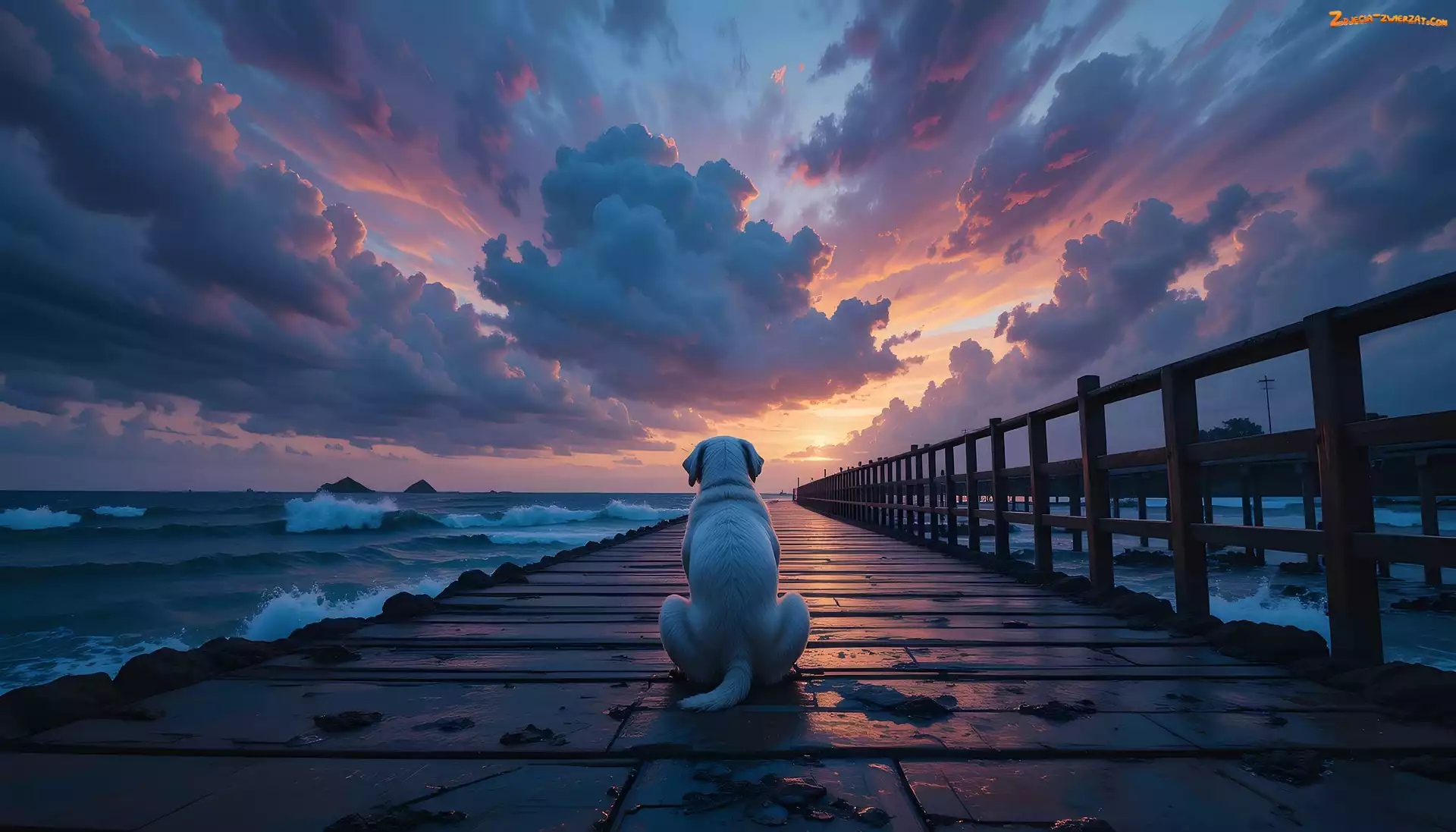 Zdjęcie: Zachód słońca, Pomost, Chmury, Morze, Pies