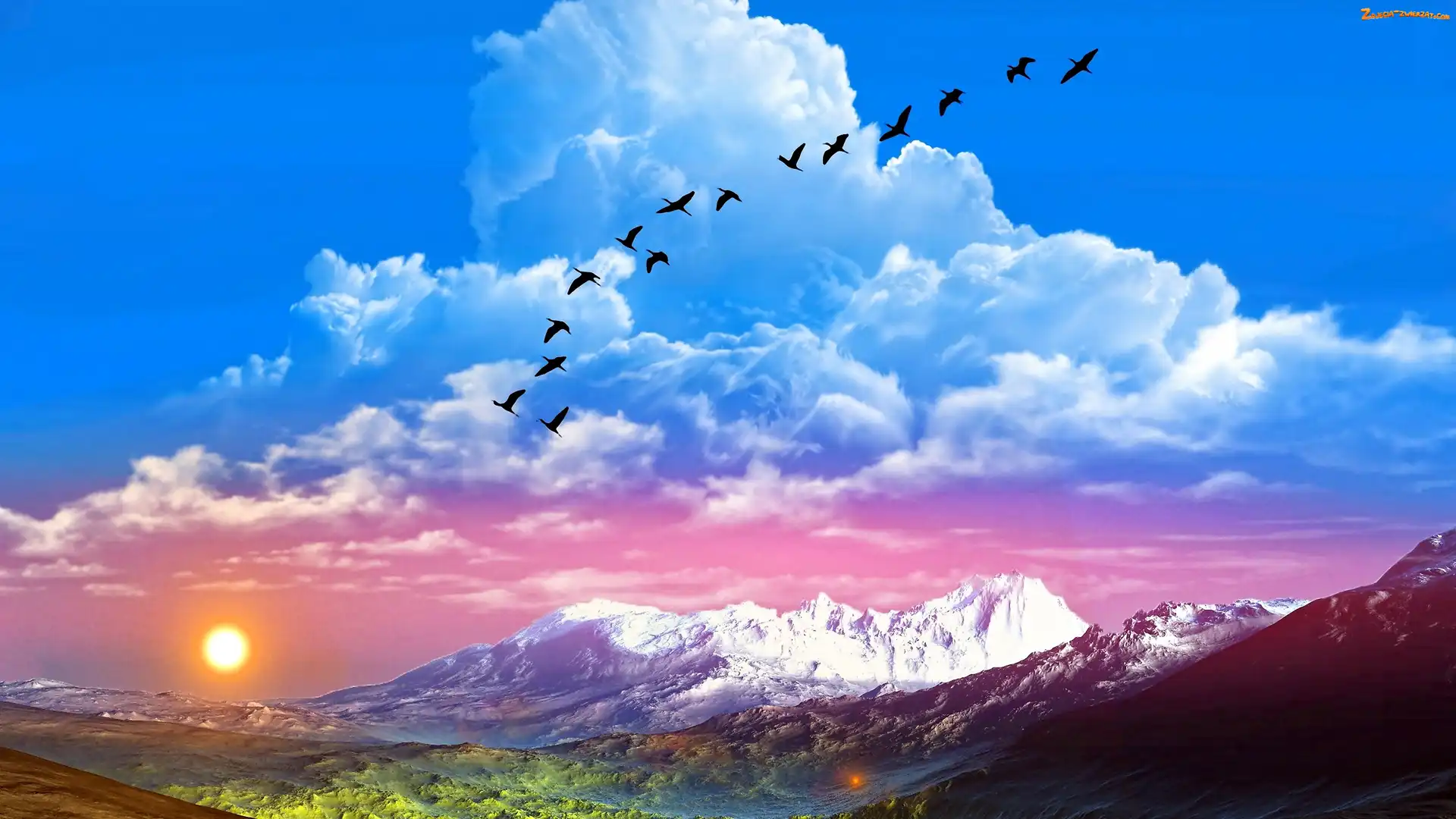 Zdjęcie: Chmury, Góry, Krajobraz, Fantasy, Słońce, Ptaki