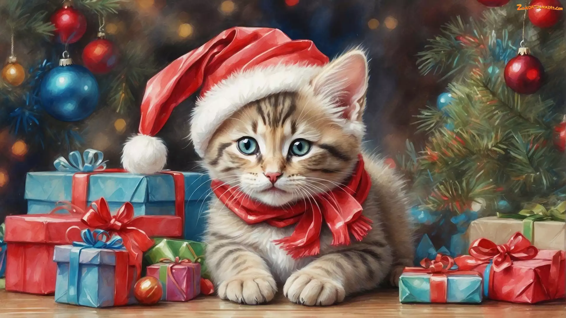 Zdjęcie: Prezenty, Grafika, Boże Narodzenie, Czapka, Bombki, Kot, Choinka