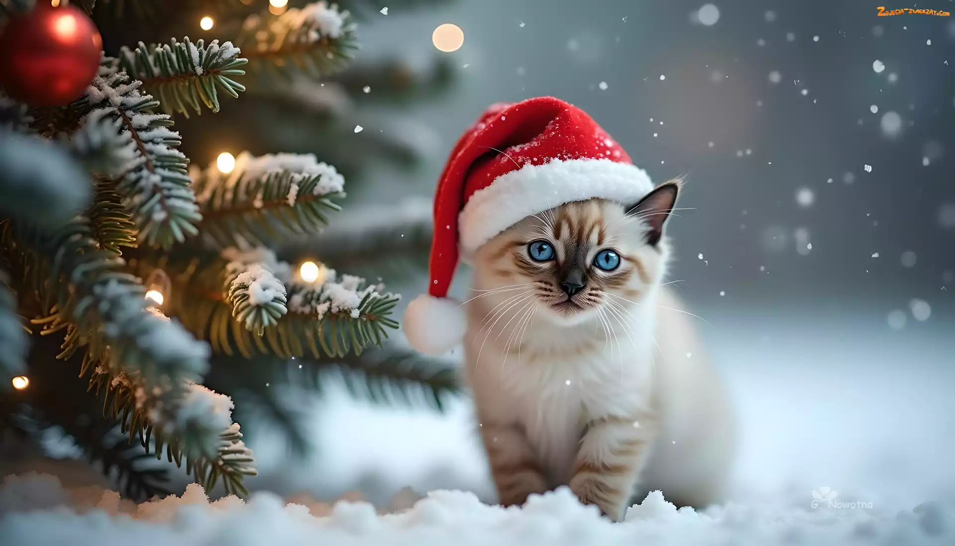 Zdjęcie: Śnieg, Kot, Czapka, Choinka, Grafika, Mikołaja, Zima