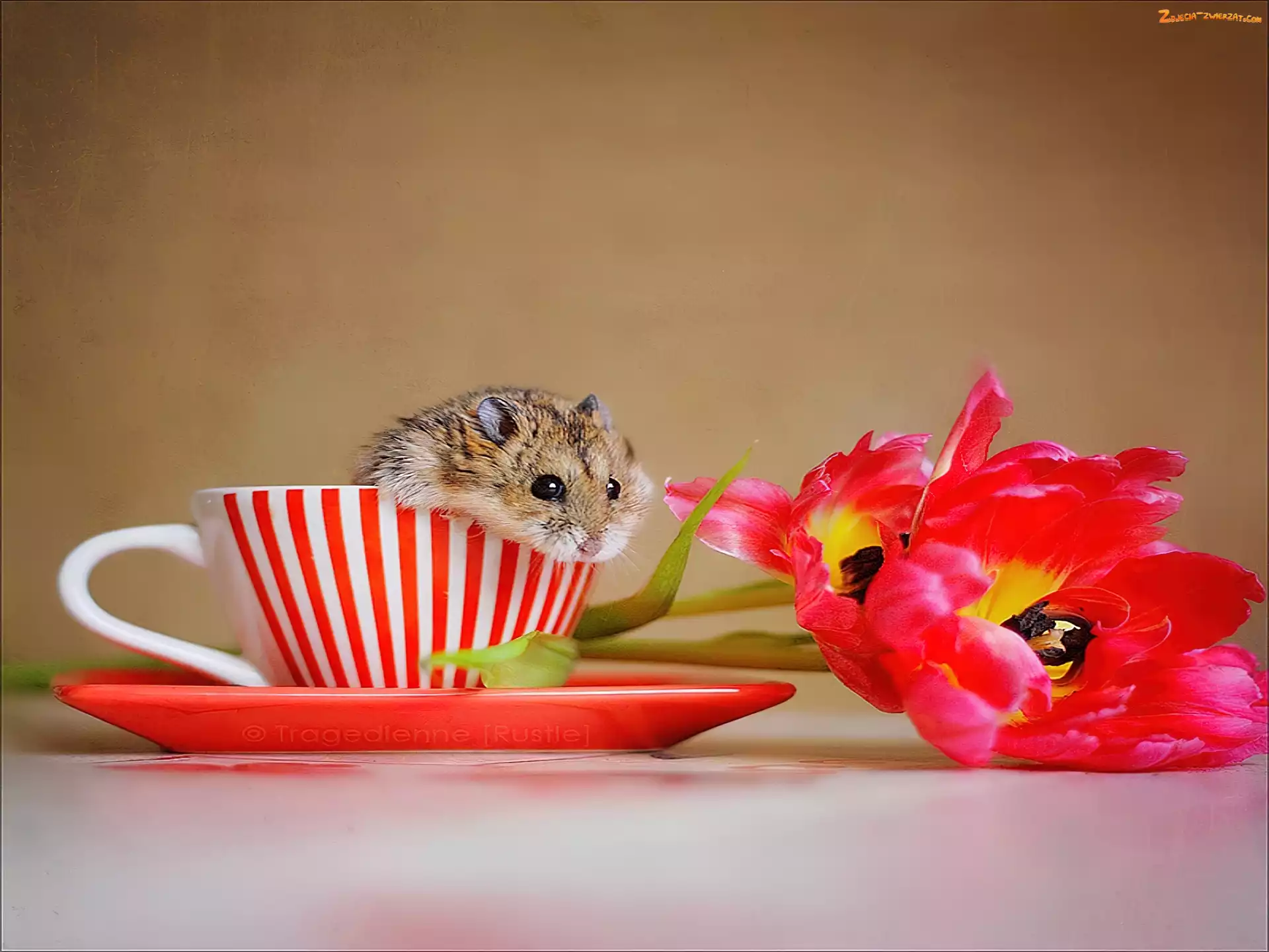 Zdjęcie: Filiżanka, Chomik, Tulipany