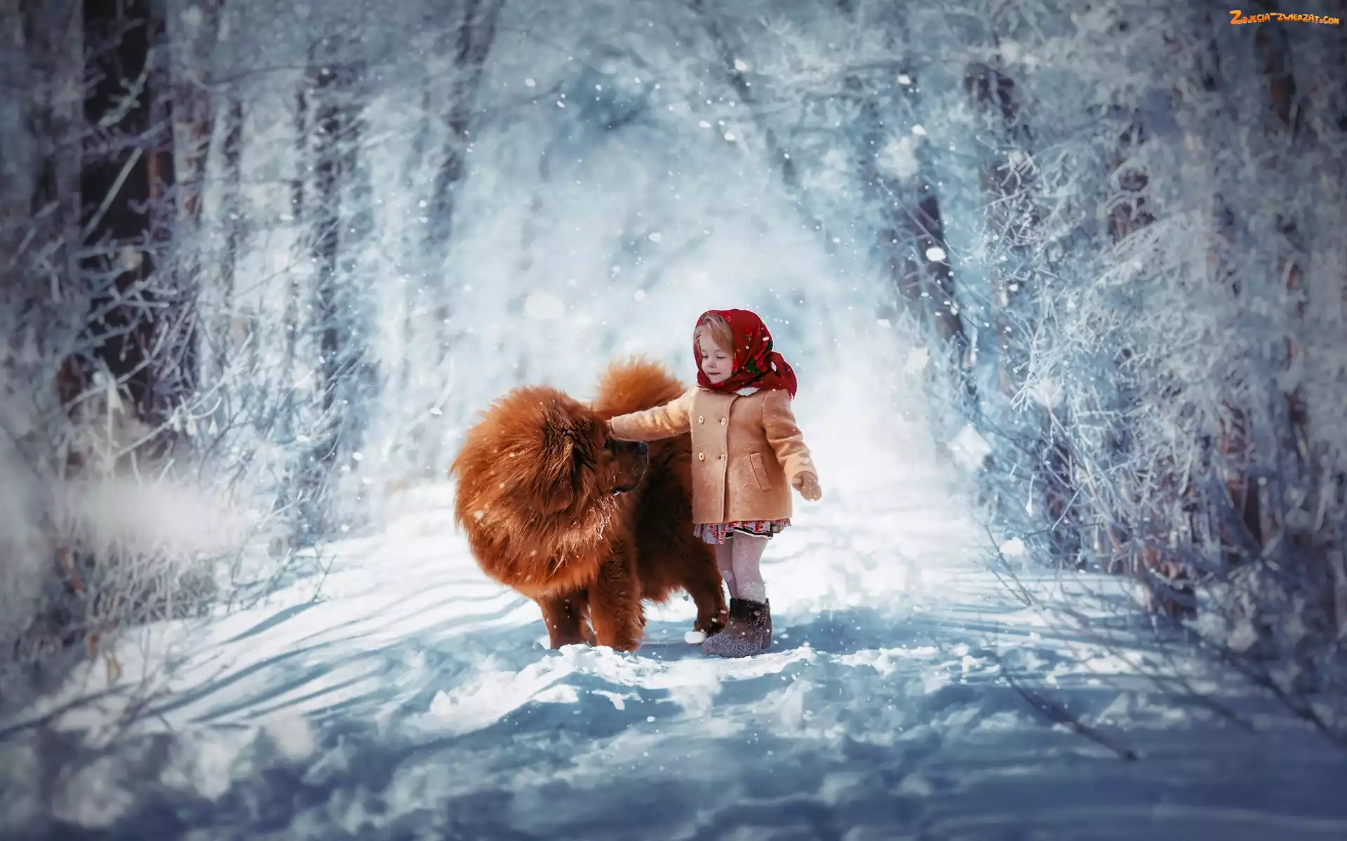 Zdjęcie: Chow chow, Dziewczynka, Droga, Las, Pies, Zima