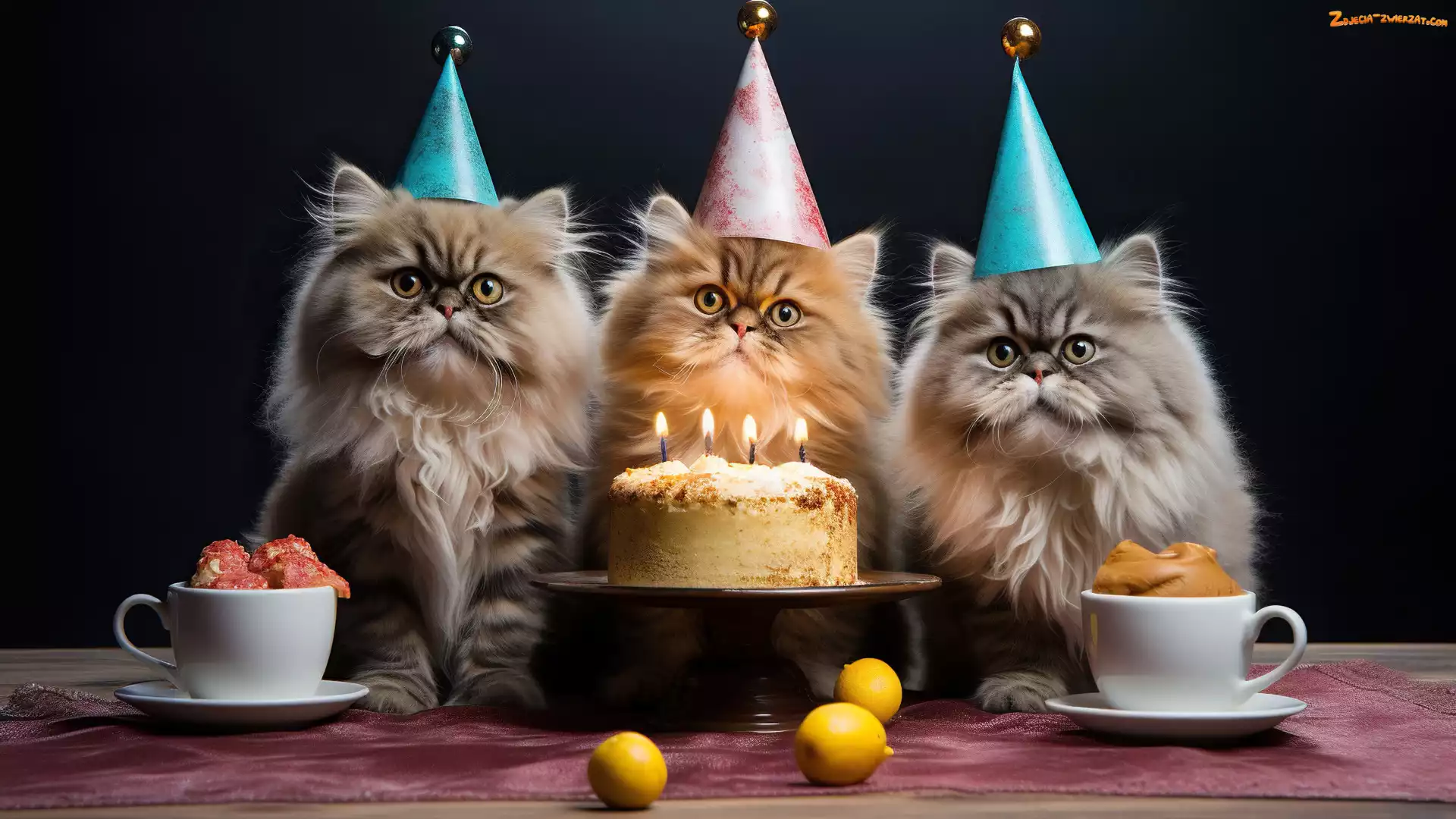 Zdjęcie: Filiżanki, Świeczki, Cytryny, Trzy, Urodziny, Koty, Tort, Czapeczki