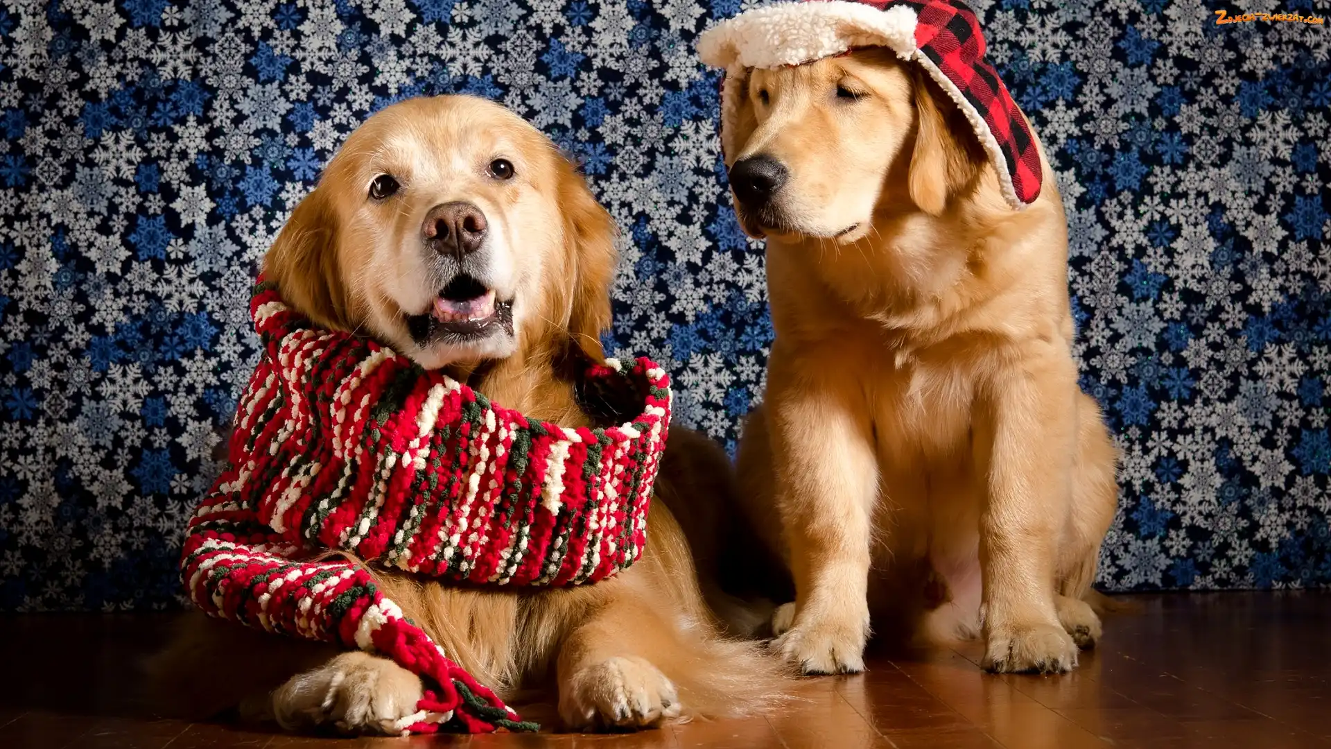 Zdjęcie: Czapka, Szalik, Psy, Dwa, Golden retriever