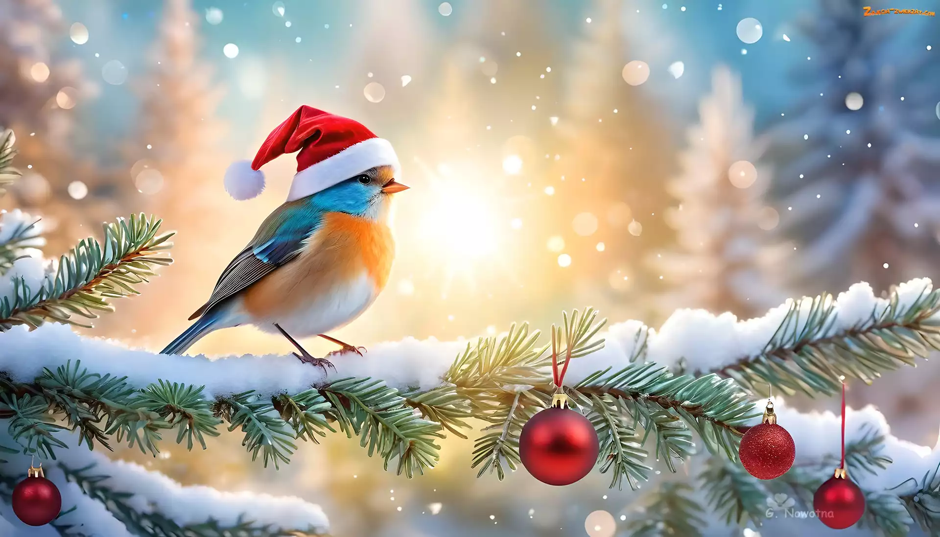 Zdjęcie: Czapka, Ptak, Świerk, Grafika, Śnieg, Bombki, Mikołaja, Kolorowy, Gałąź