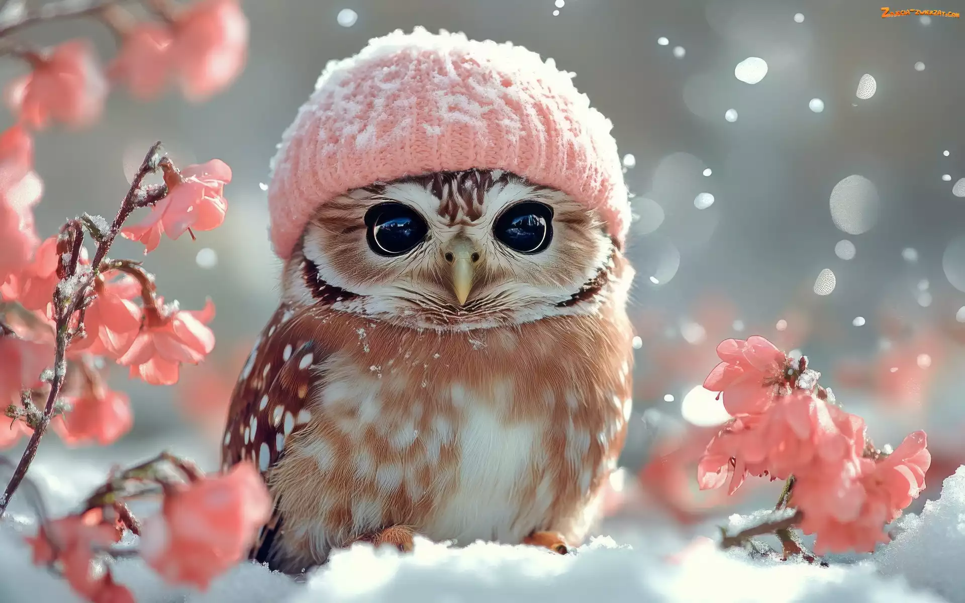 Zdjęcie: Kwiaty, Sowa, Pójdźka, Czapka, Grafika, Zima, Śnieg