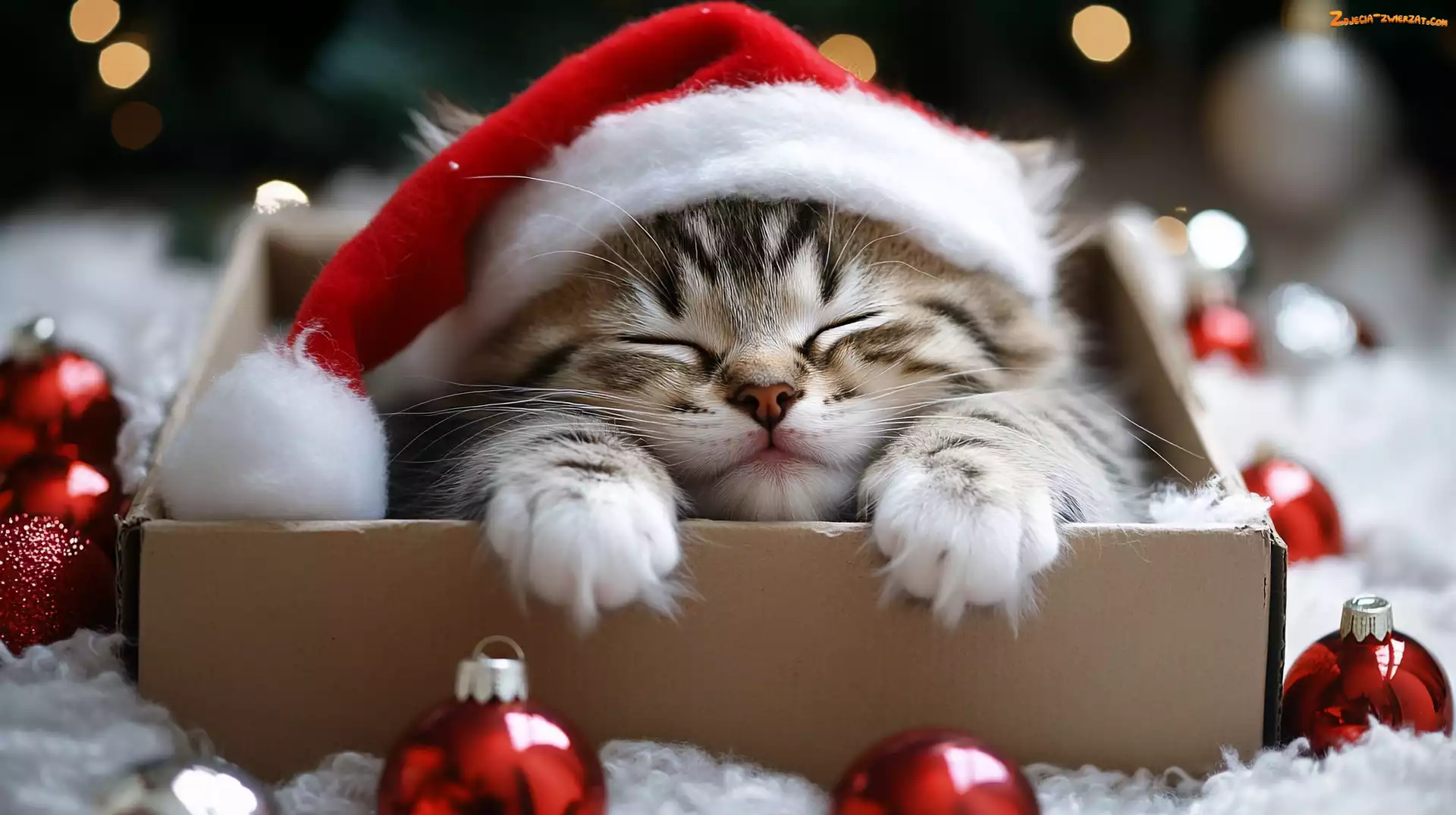 Zdjęcie: Mikołaja, Mały, Szary, Czapka, Bombki, Kot, Pudełko