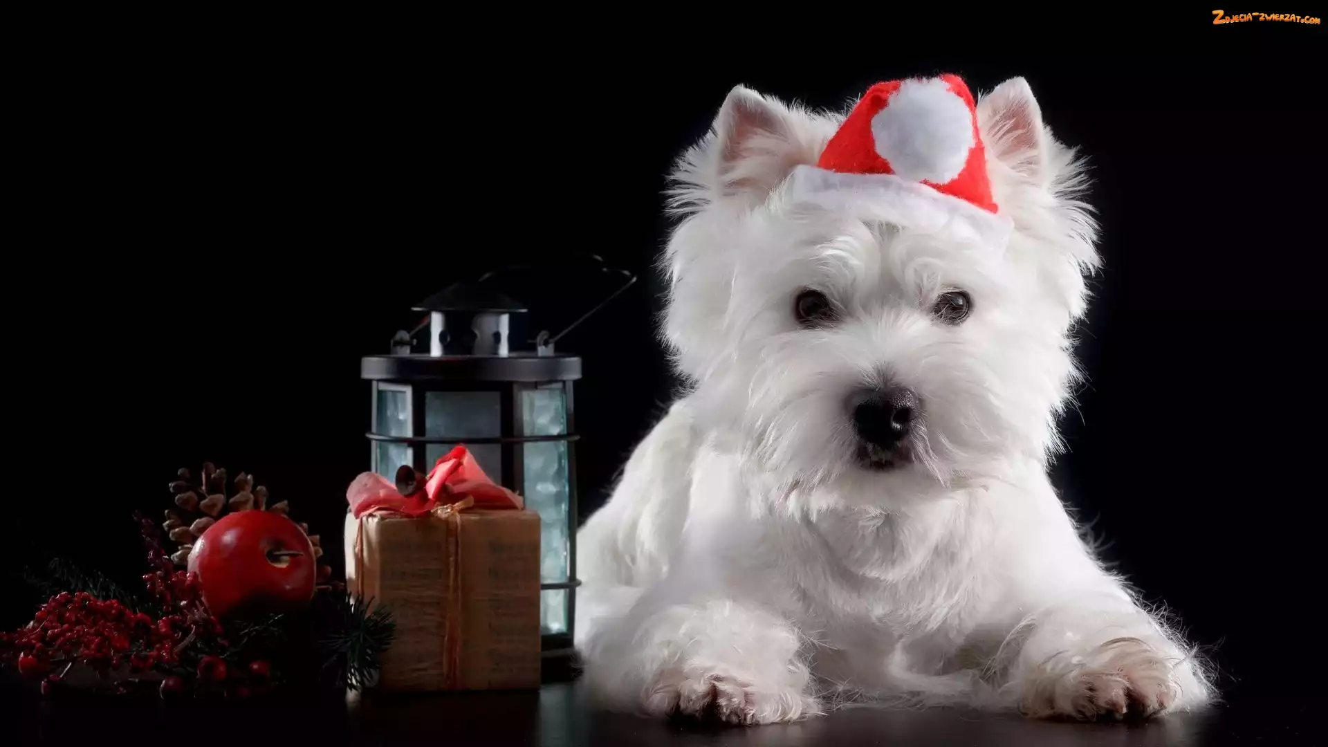 Zdjęcie: Prezent, West Highland White Terrier, Biały, Mikołaja, Lampion, Pies, Czapka