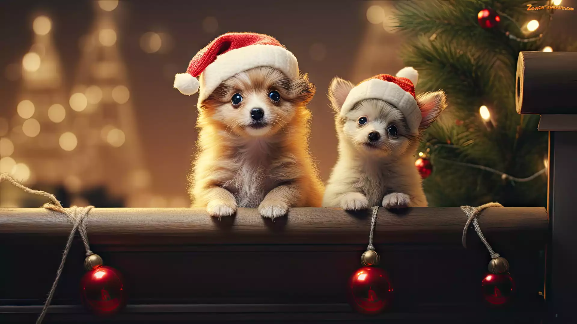 Zdjęcie: Dwa, Psy, Choinka, Czapki