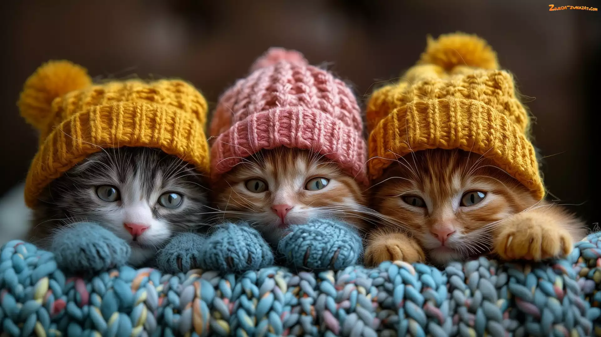 Zdjęcie: Trzy, Koty, Wełniane, Czapki