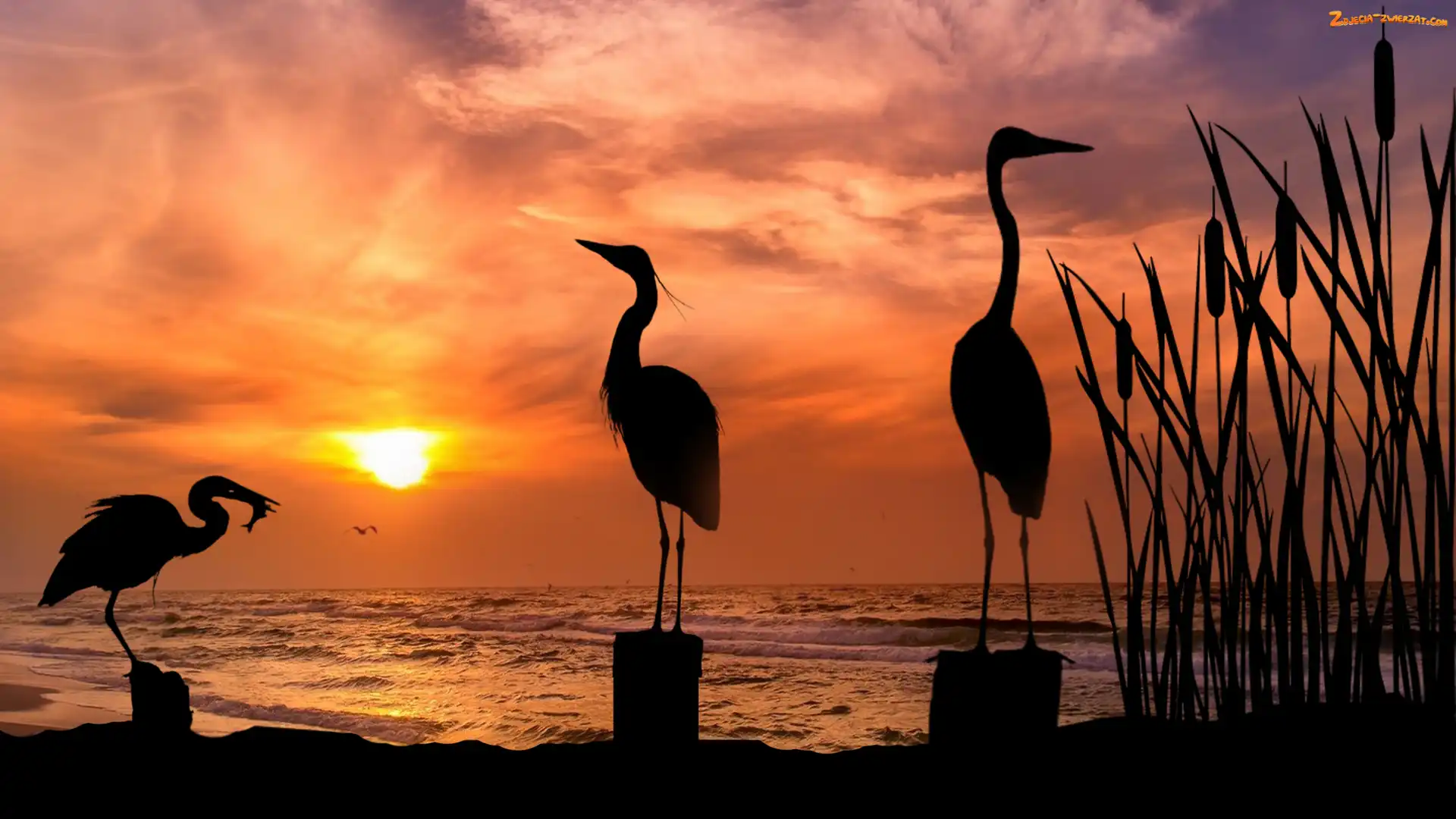 Zdjęcie: Brzeg, Czaple, Zachód słońca, Fale, Morze, Tatarak