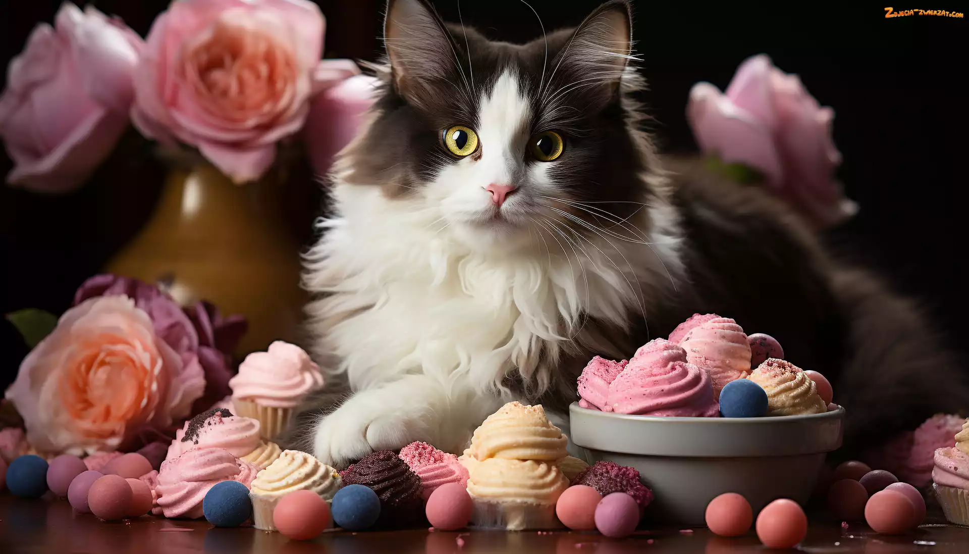 Zdjęcie: Babeczki, Kot, Kwiaty, Czarno-biały, Puszysty