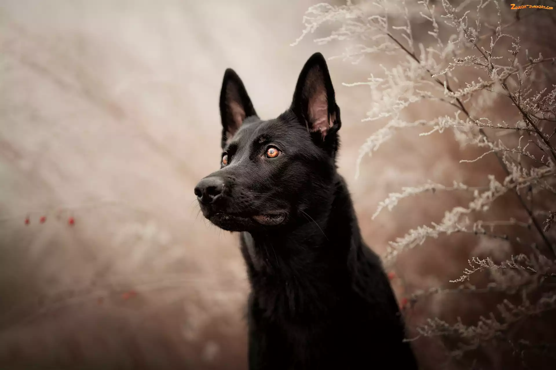Zdjęcie: Czarny owczarek niemiecki, Rośliny, Pies, Oszronione