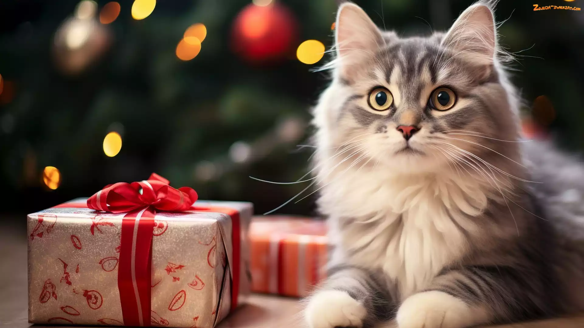Zdjęcie: Kokarda, Puszysty, Kotek, Czerwona, Światełka, Prezenty, Bombki
