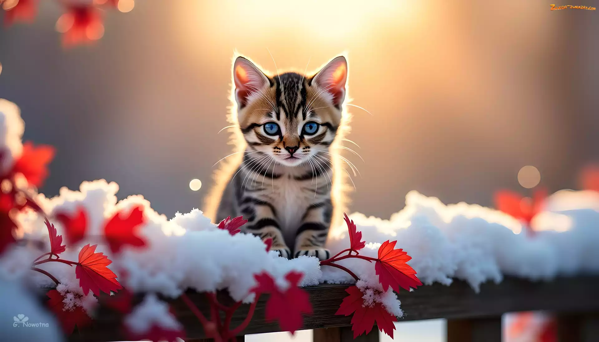 Zdjęcie: Liście, Kotek, Ośnieżony, Czerwone, Grafika, Płot, Śnieg