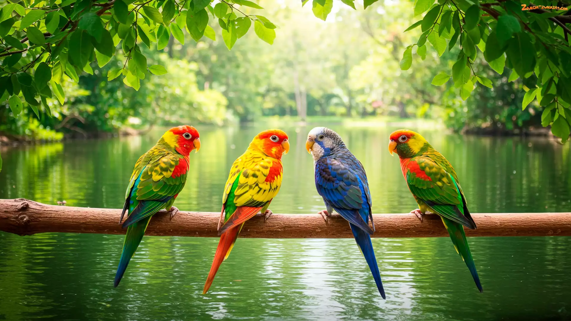 Zdjęcie: Drzewa, Kolorowe, Papugi, Cztery, Gałąź, Woda