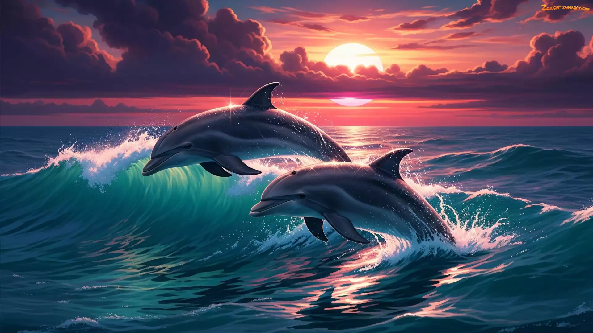 Dwa, Zachód słońca, Chmury, Fala, Grafika, Morze, Delfiny
