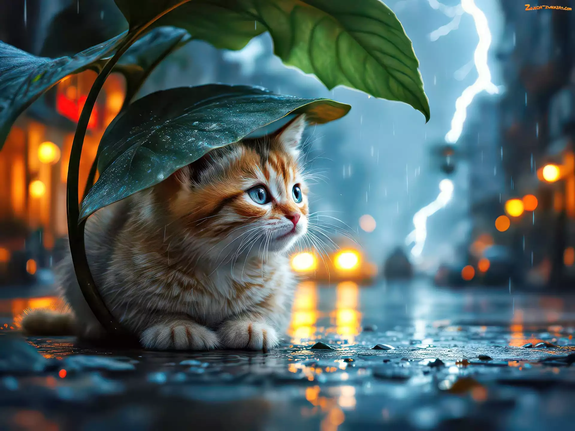 Zdjęcie: Kotek, Liść, Ulica, Deszcz