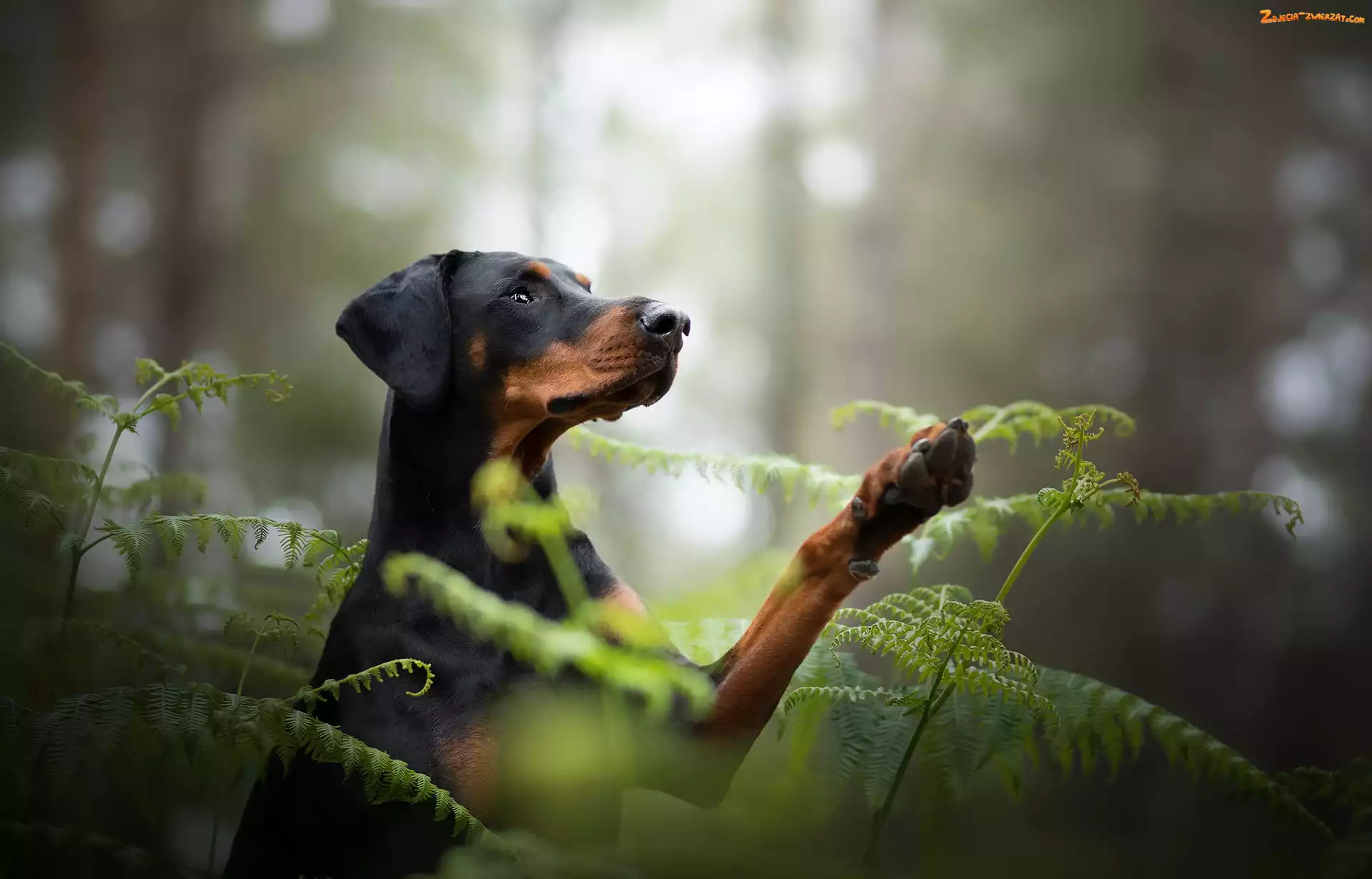Zdjęcie: Doberman, Las, Pies, Paprocie