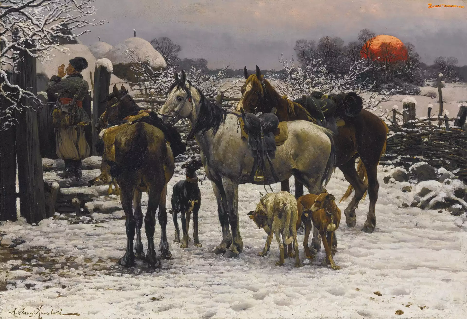 Zdjęcie: Alfred Wierusz-Kowalski, Zima, Konie, Postacie, Reprodukcja obrazów, Psy, Dom