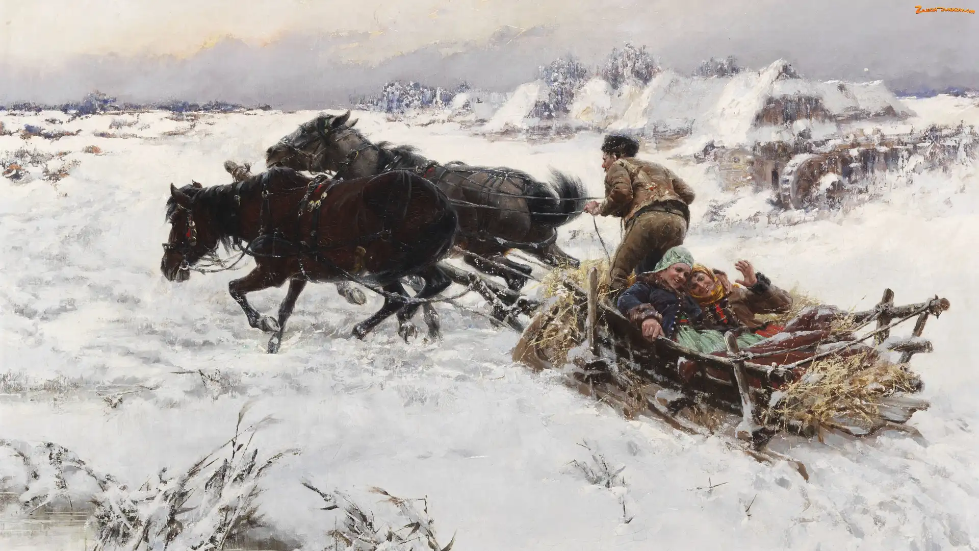 Zdjęcie: Jaroslav Vesin, Domy, Zima, Malarstwo, Konie, Ludzie, Jarosław Weszin, Obraz, Sanie