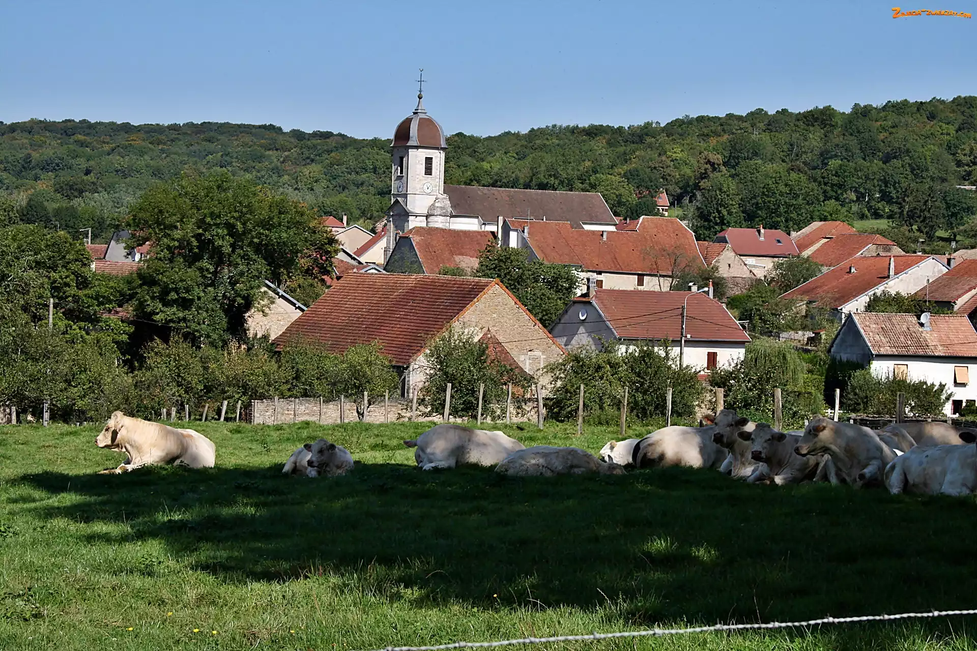 Zdjęcie: Domy, Borey, Krowy, Pastwisko, Village, Kościół