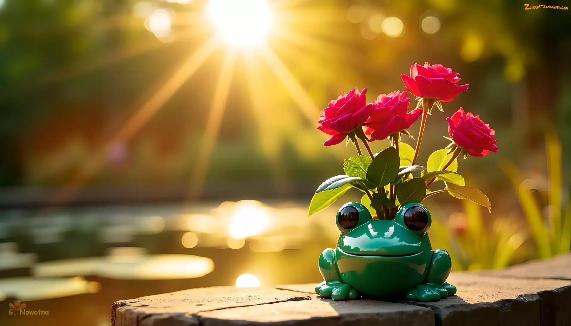 Zdjęcie: Grafika, Żaba, Zielona, Doniczka, Czerwone, Kwiaty