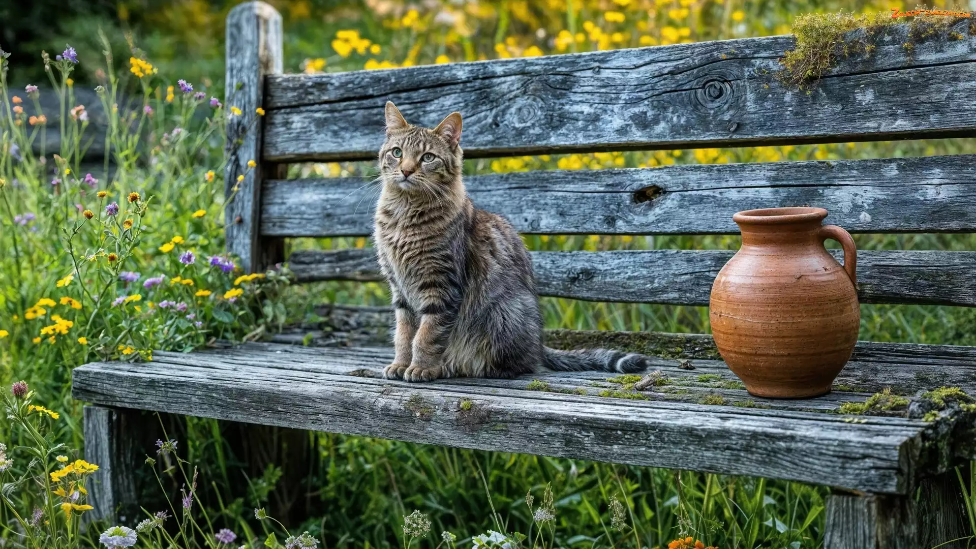 Zdjęcie: Ławka, Drewniana, Dzbanek, Szary, Kot