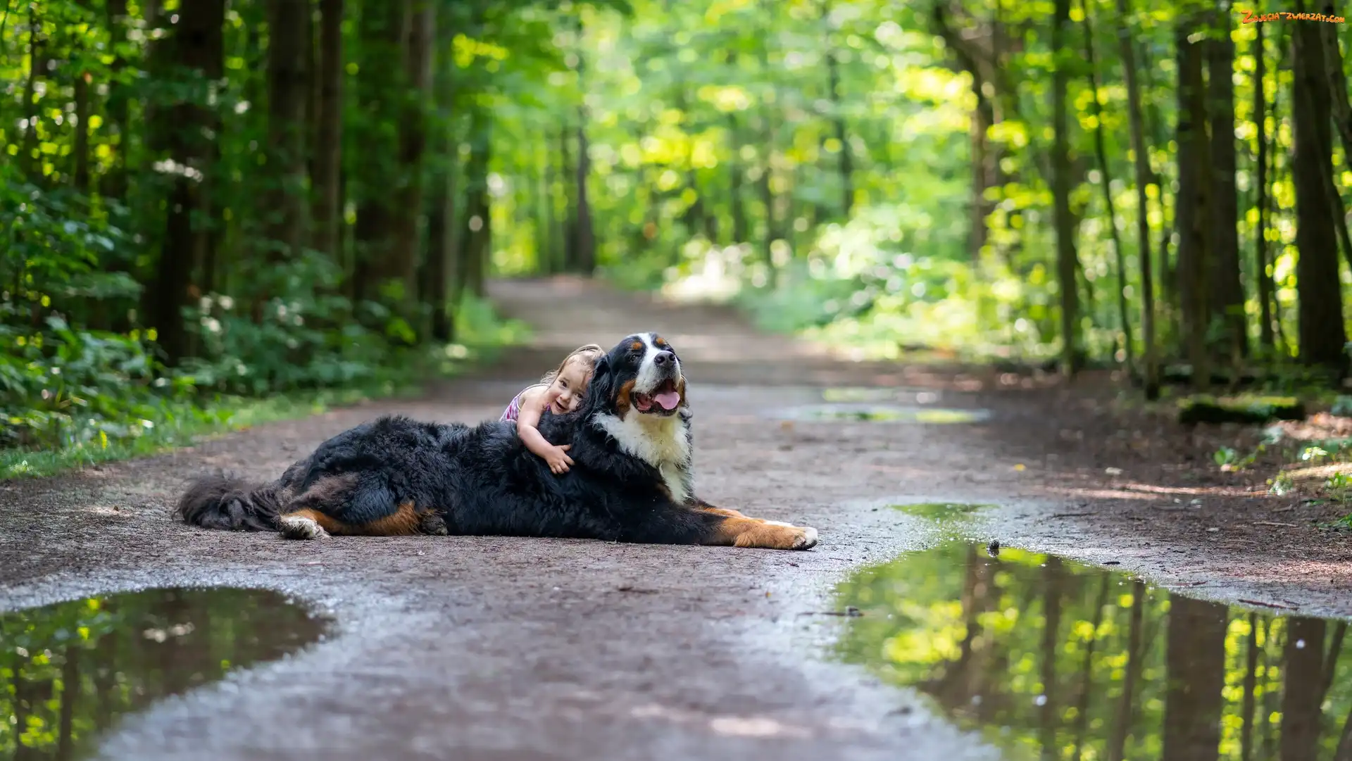 Zdjęcie: Las, Droga, Berneński pies pasterski, Pies, Dziecko
