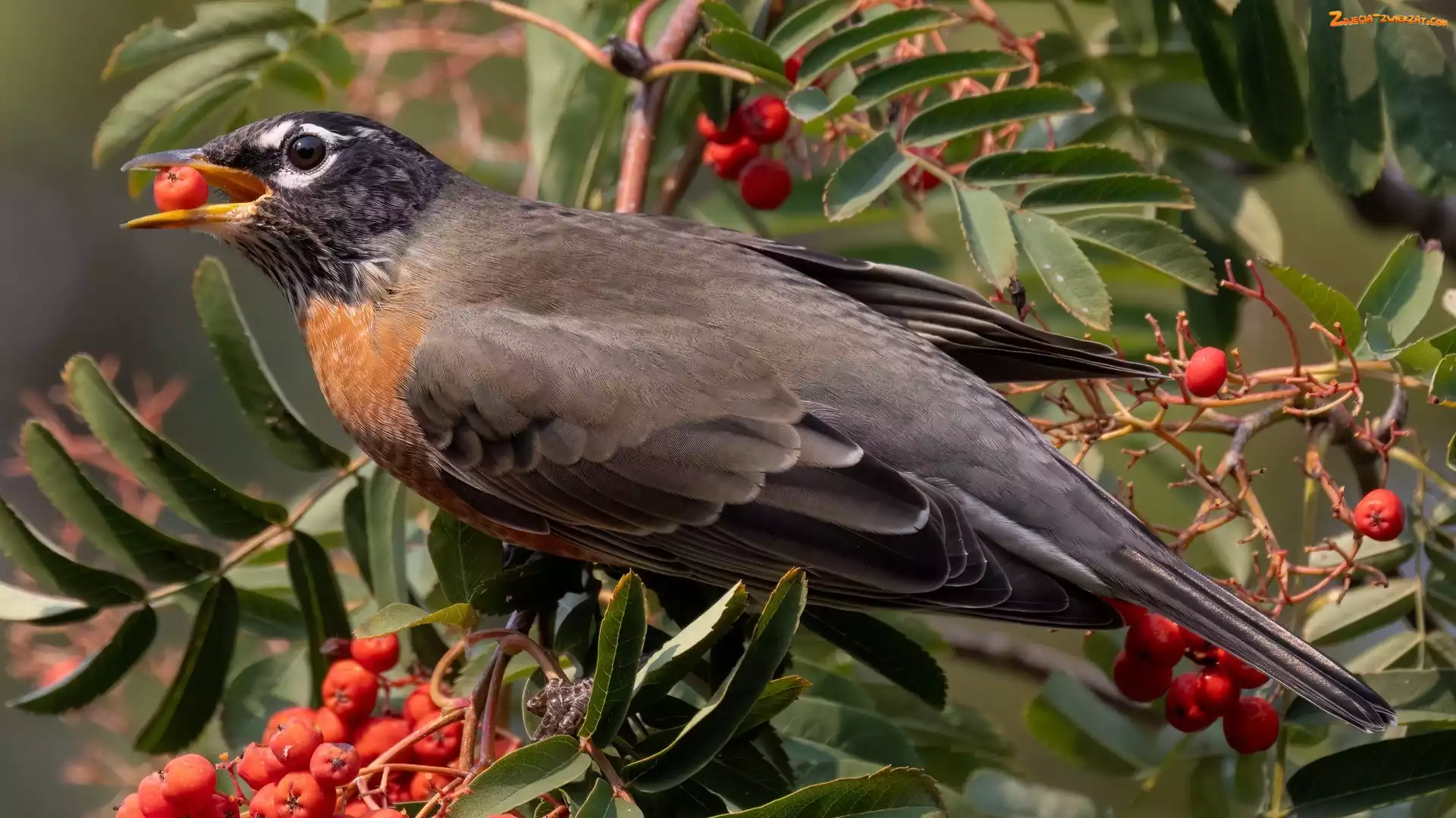 Zdjęcie: Owoce, Gałązki, Ptak, Drozd wędrowny, Jarzębina, Czerwone