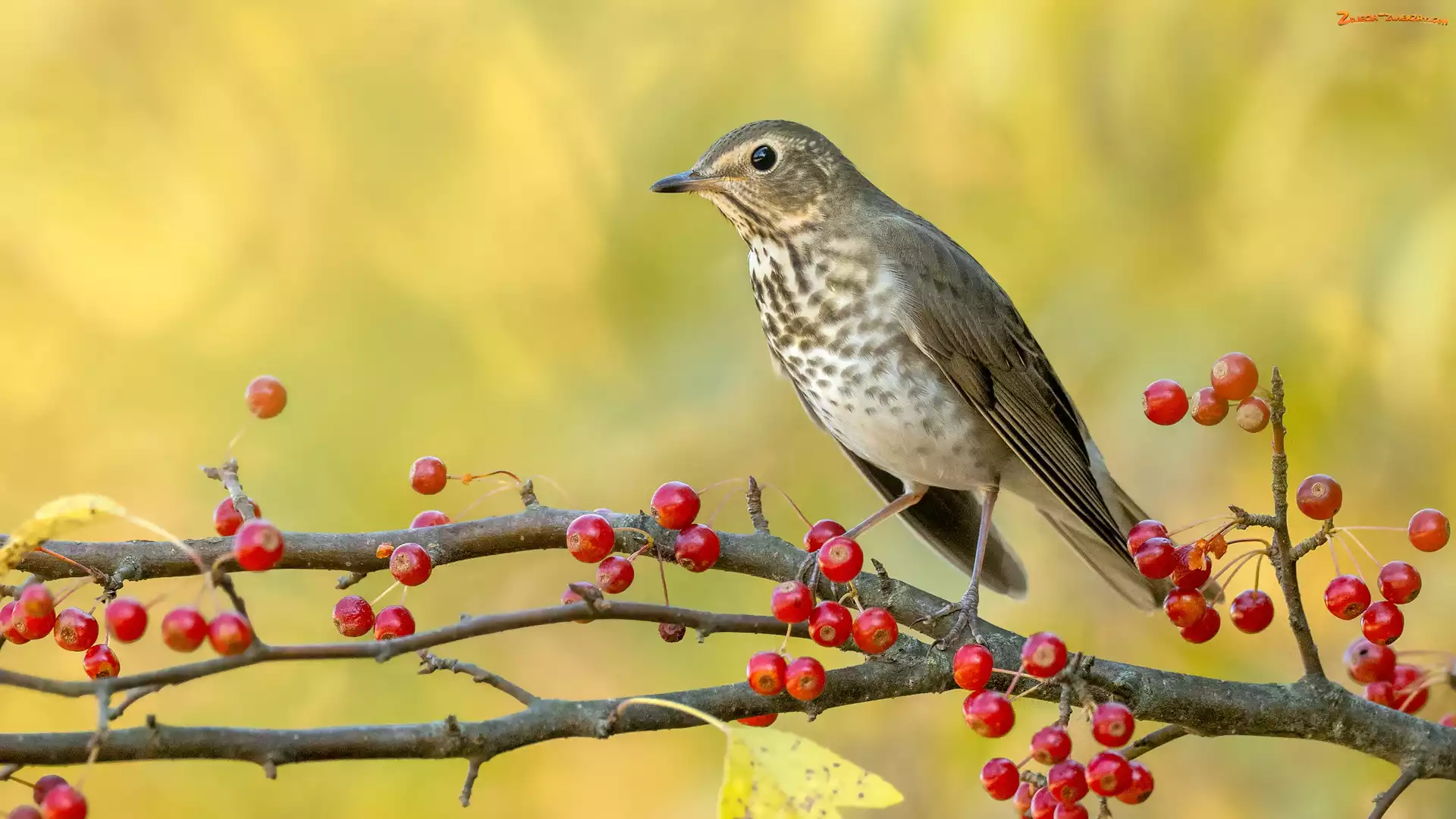 Ptak, Drozd śpiewak, Gałązka, Owoce