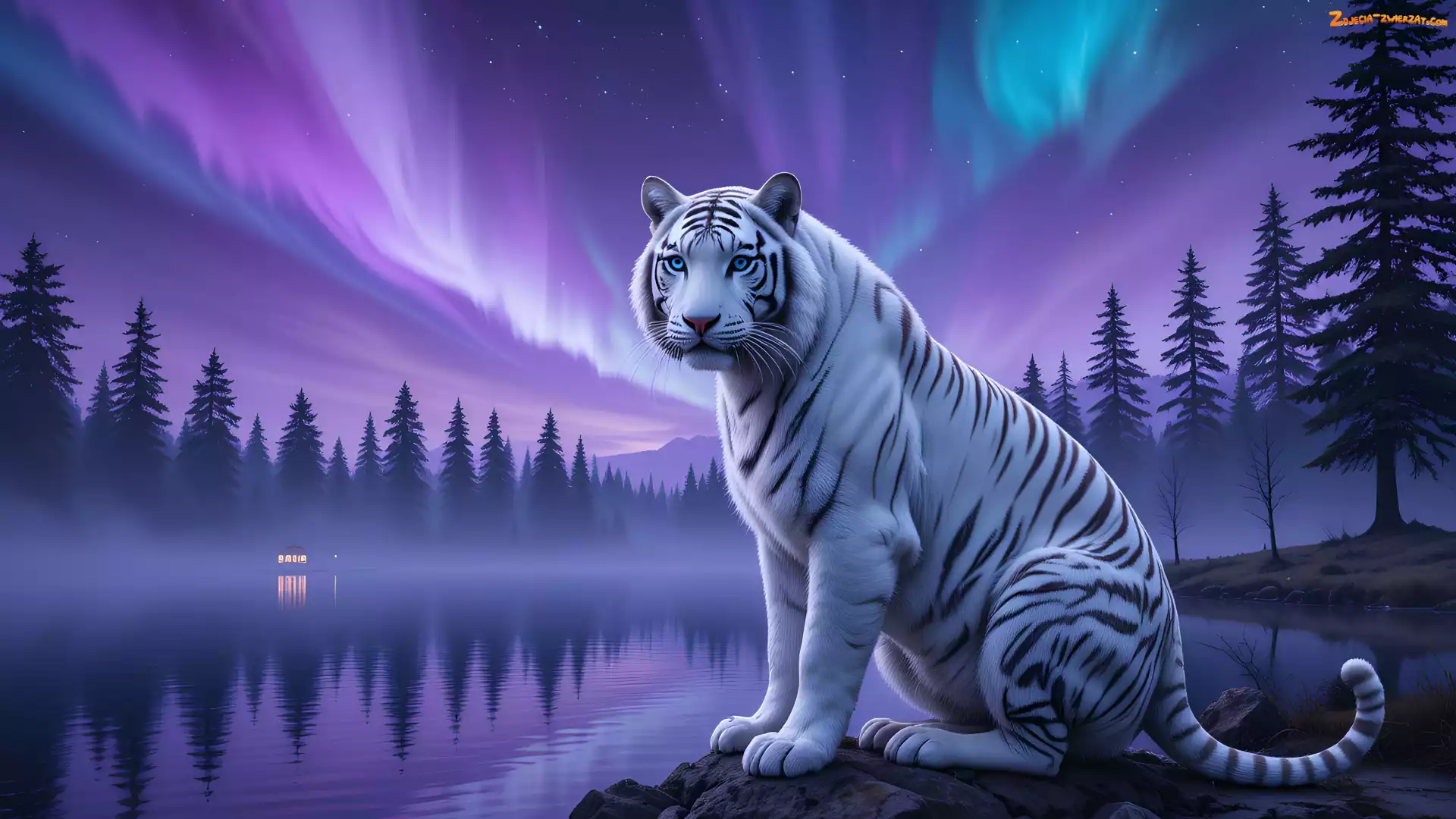 Zdjęcie: Mgła, Grafika, Biały, Rzeka, Zorza polarna, Tygrys, Drzewa