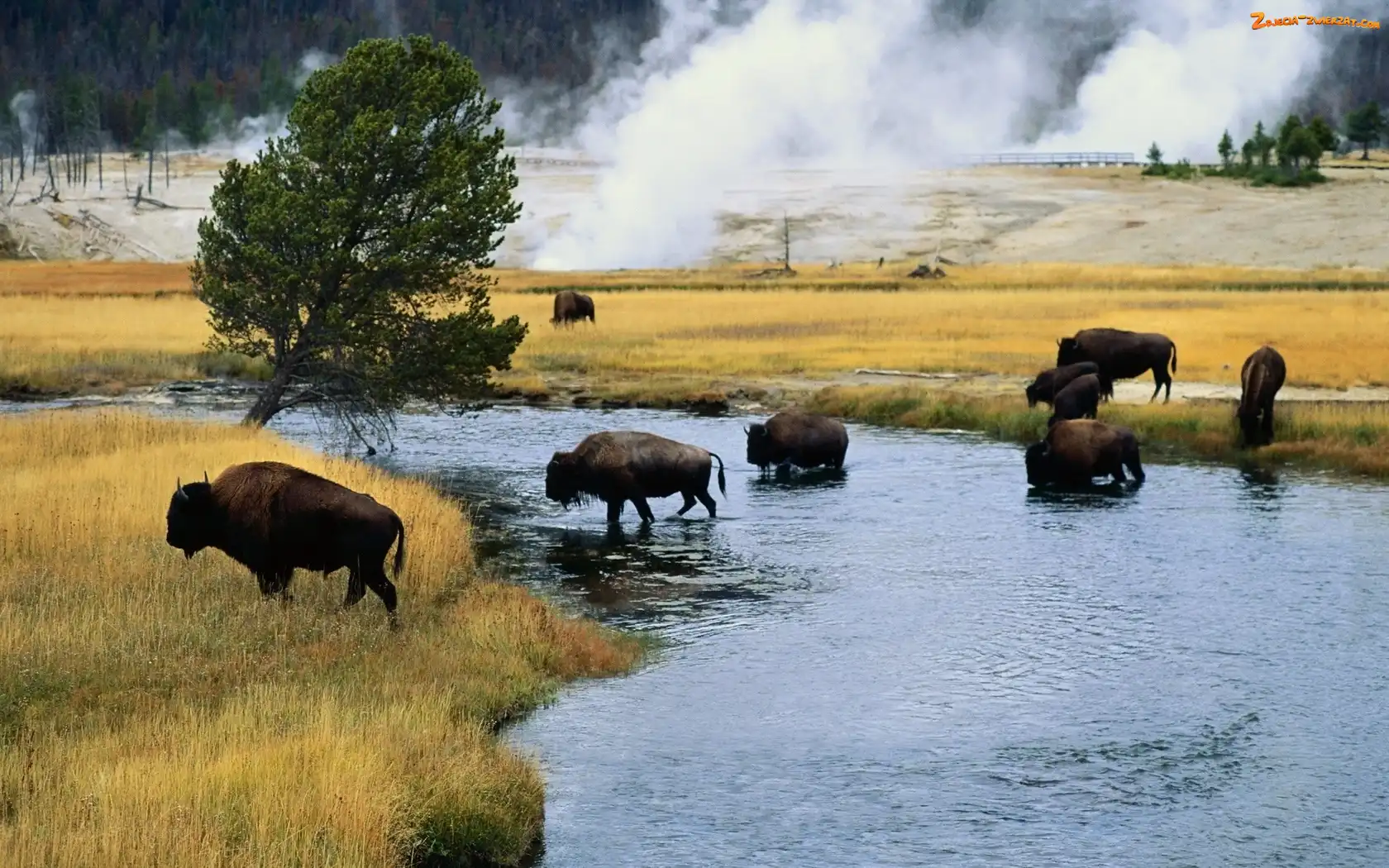 Zdjęcie: Drzewa, Łąka, Stado, Bizony, Rzeka