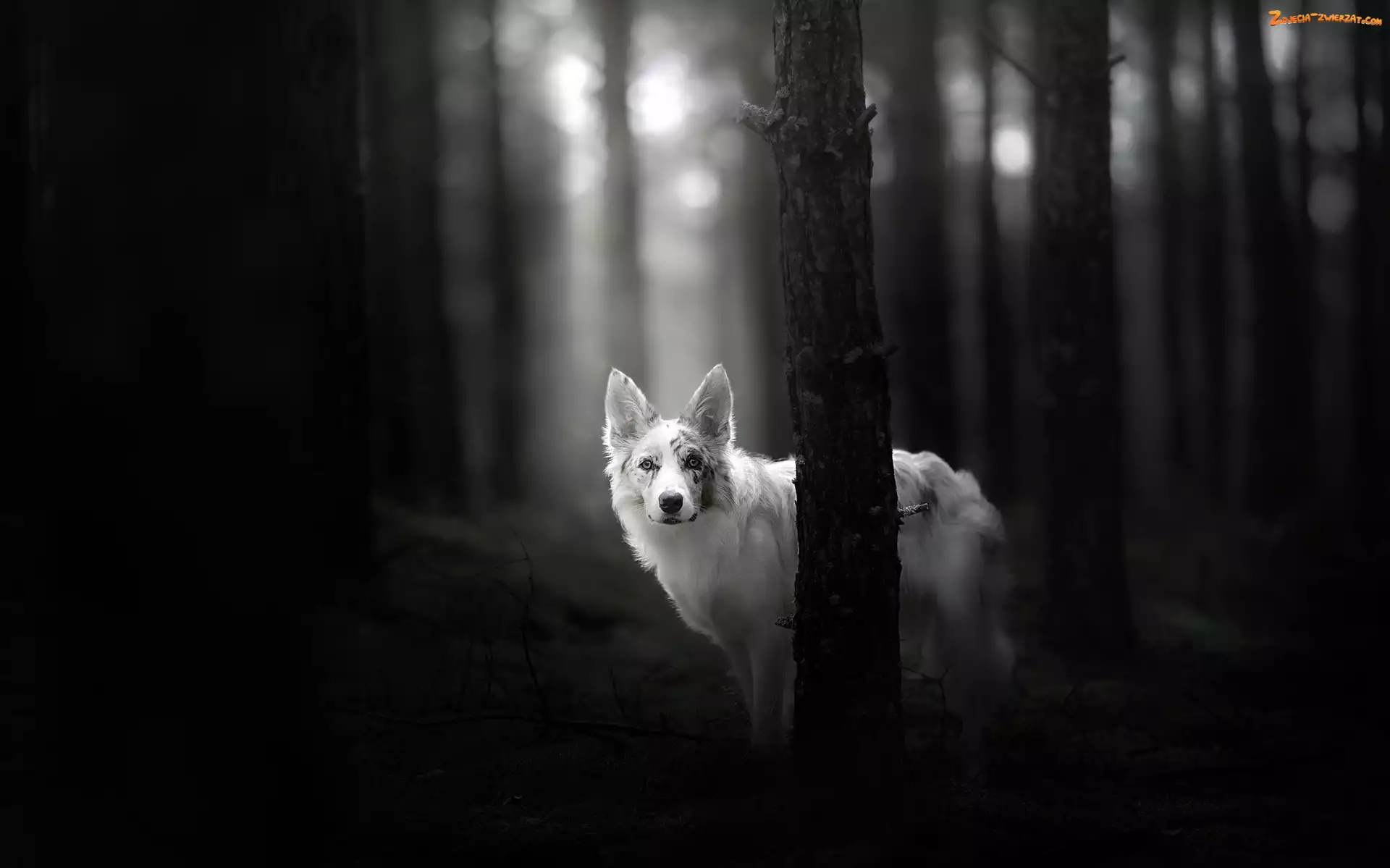 Zdjęcie: Drzewa, Czarno-Białe, Border collie, Las