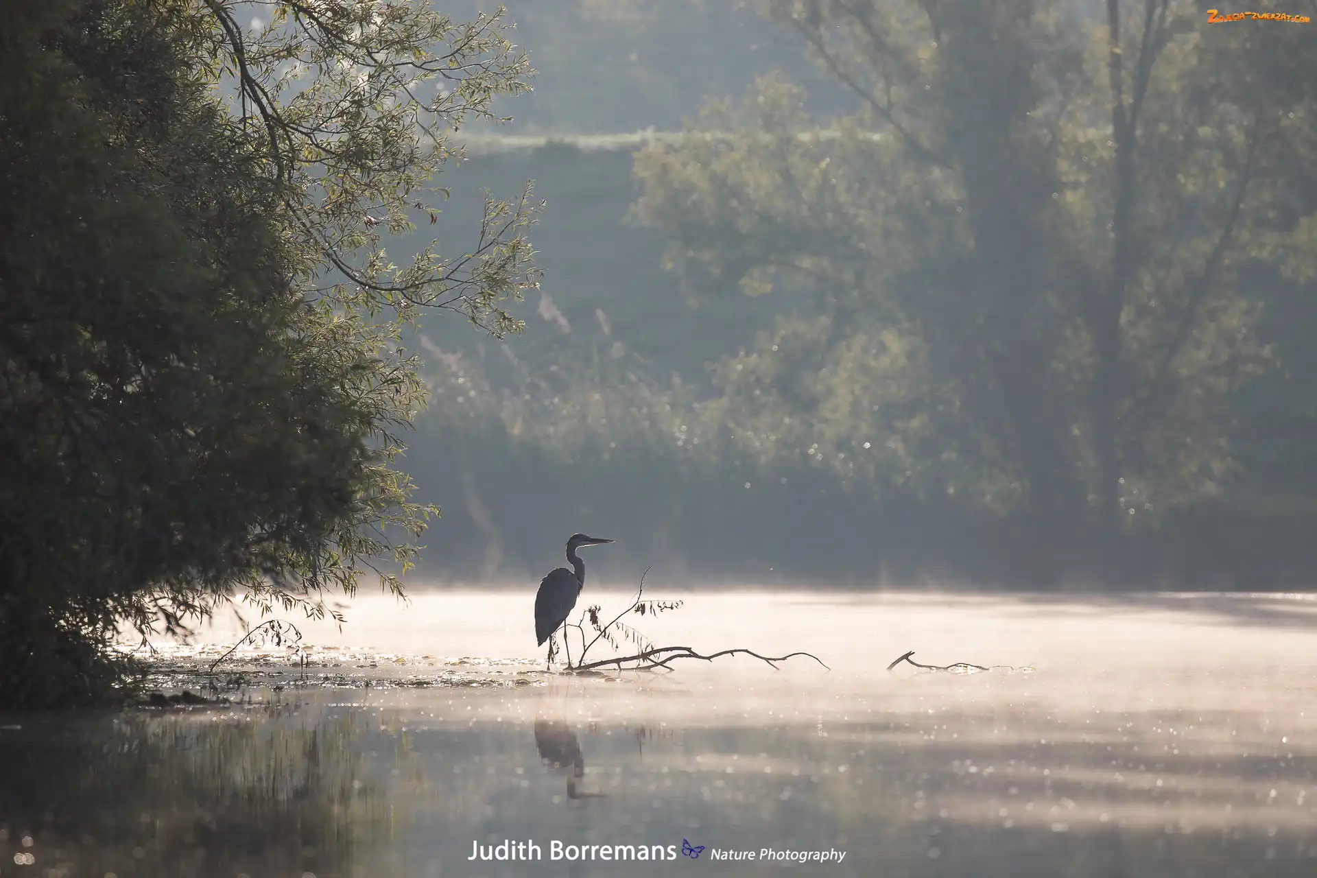 Zdjęcie: Czapla, Drzewa, Jezioro, Szuwary, Mgła, Las, Gałęzie