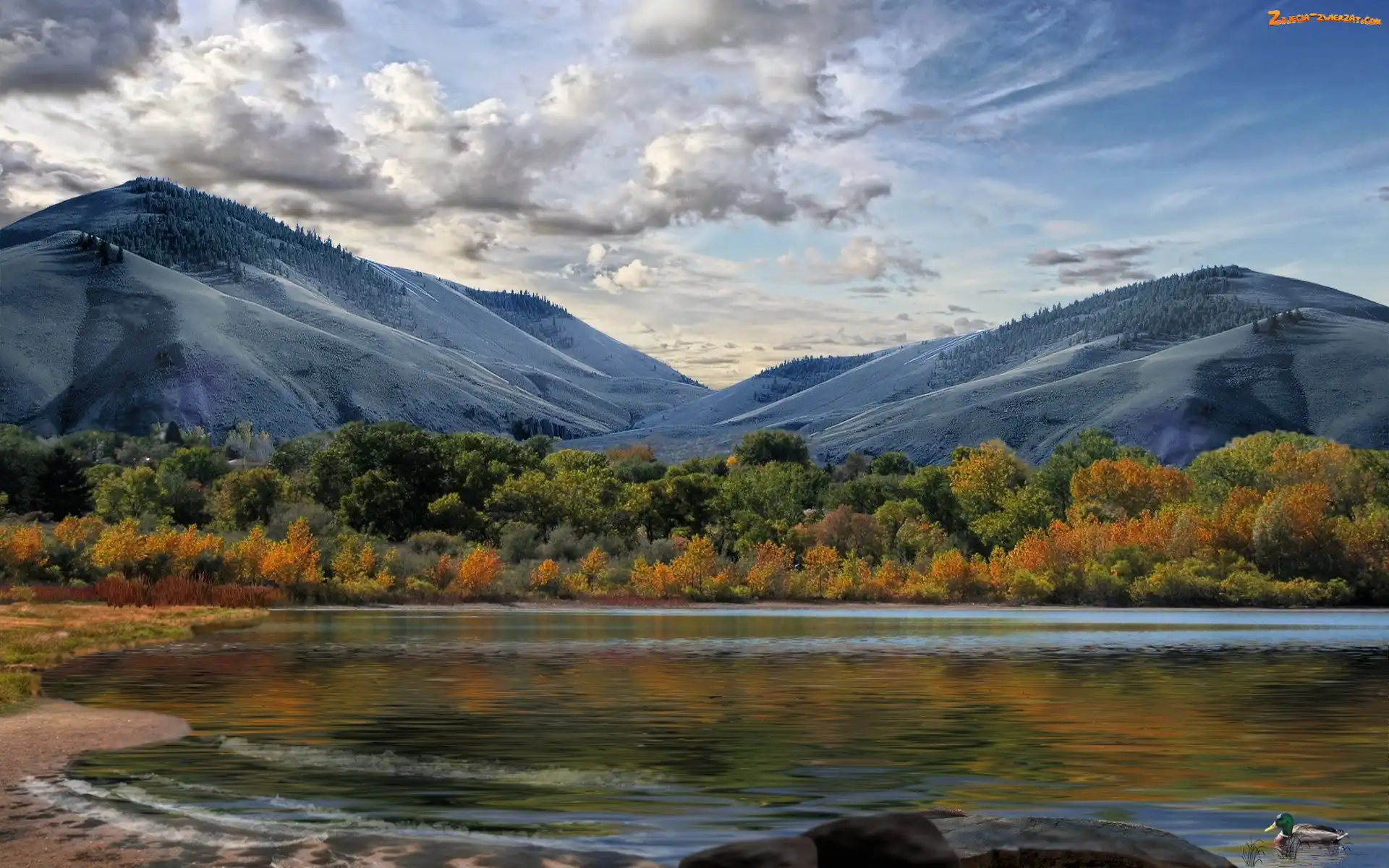 Zdjęcie: Drzewa, Kaczka, Śnieg, Góry, Jezioro