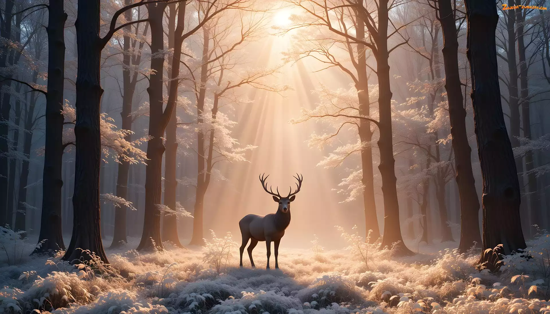 Przebijające światło, Las, Drzewa, Zima, Jeleń
