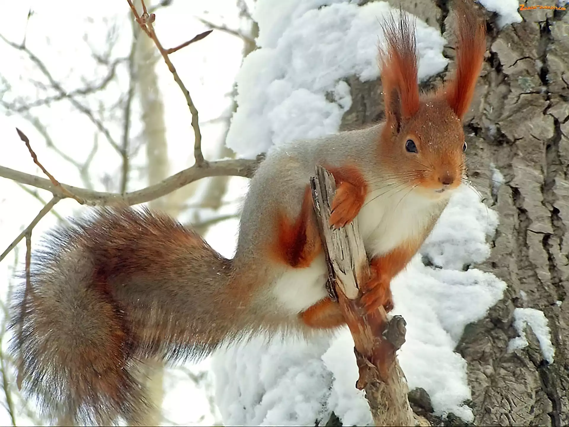 Zdjęcie: Drzewa, Śnieg, Konary, Wiewiórka