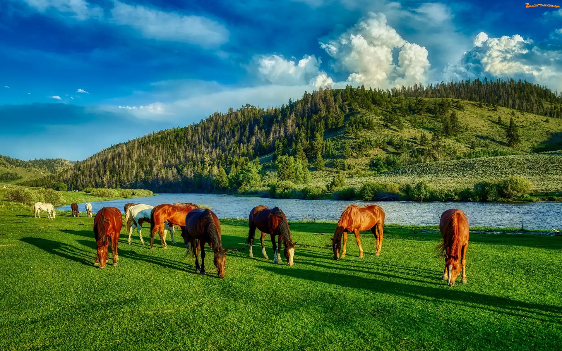 Zdjęcie: Drzewa, Wzgórza, Łąka, Konie, Rzeka