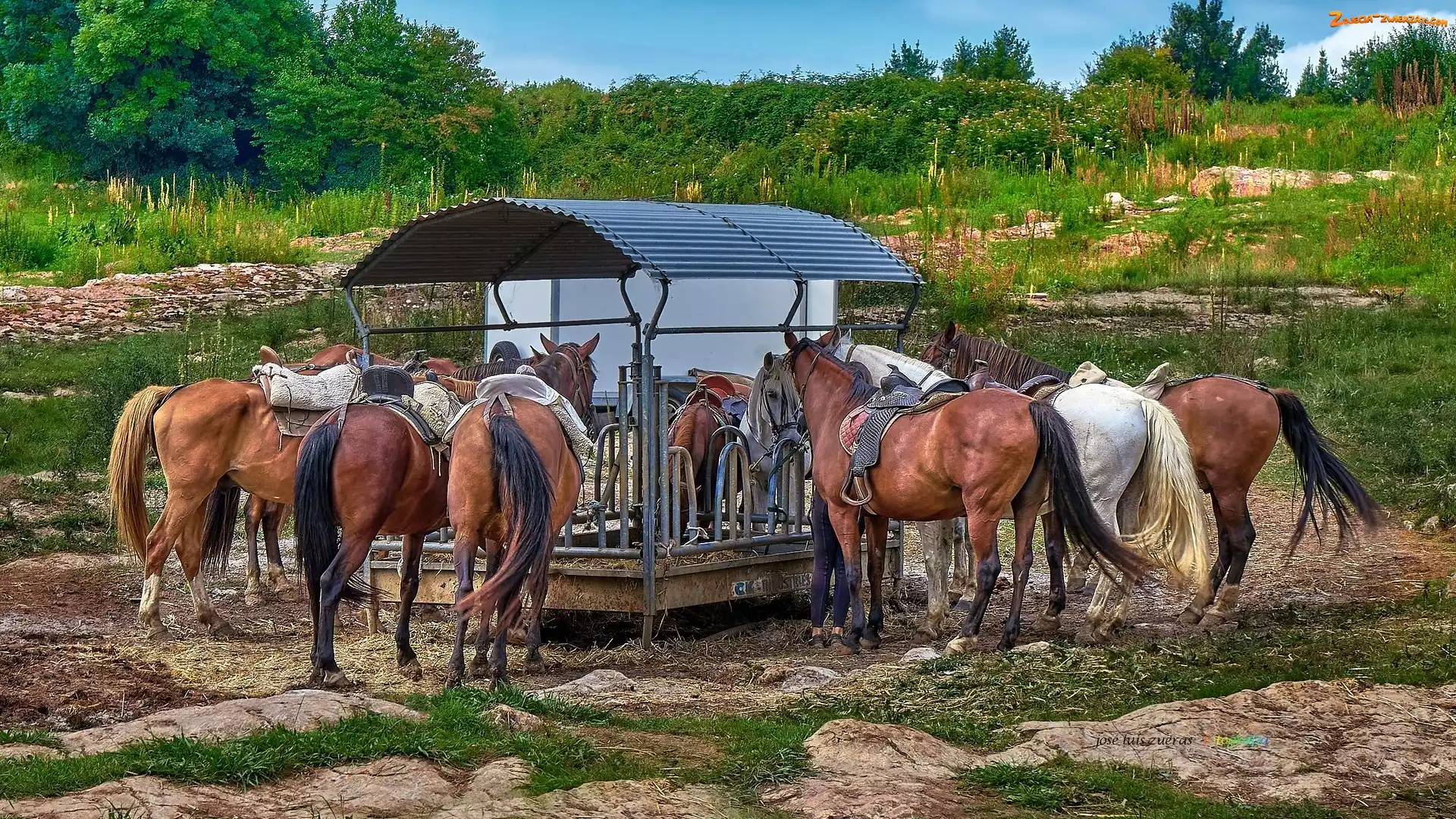 Zdjęcie: Konie, Zadaszenie, Rośliny, Drzewa