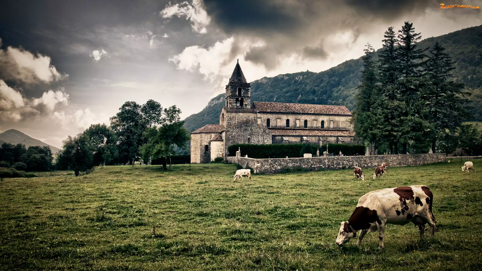 Drzewa, Krowy, Kościół, Łąka