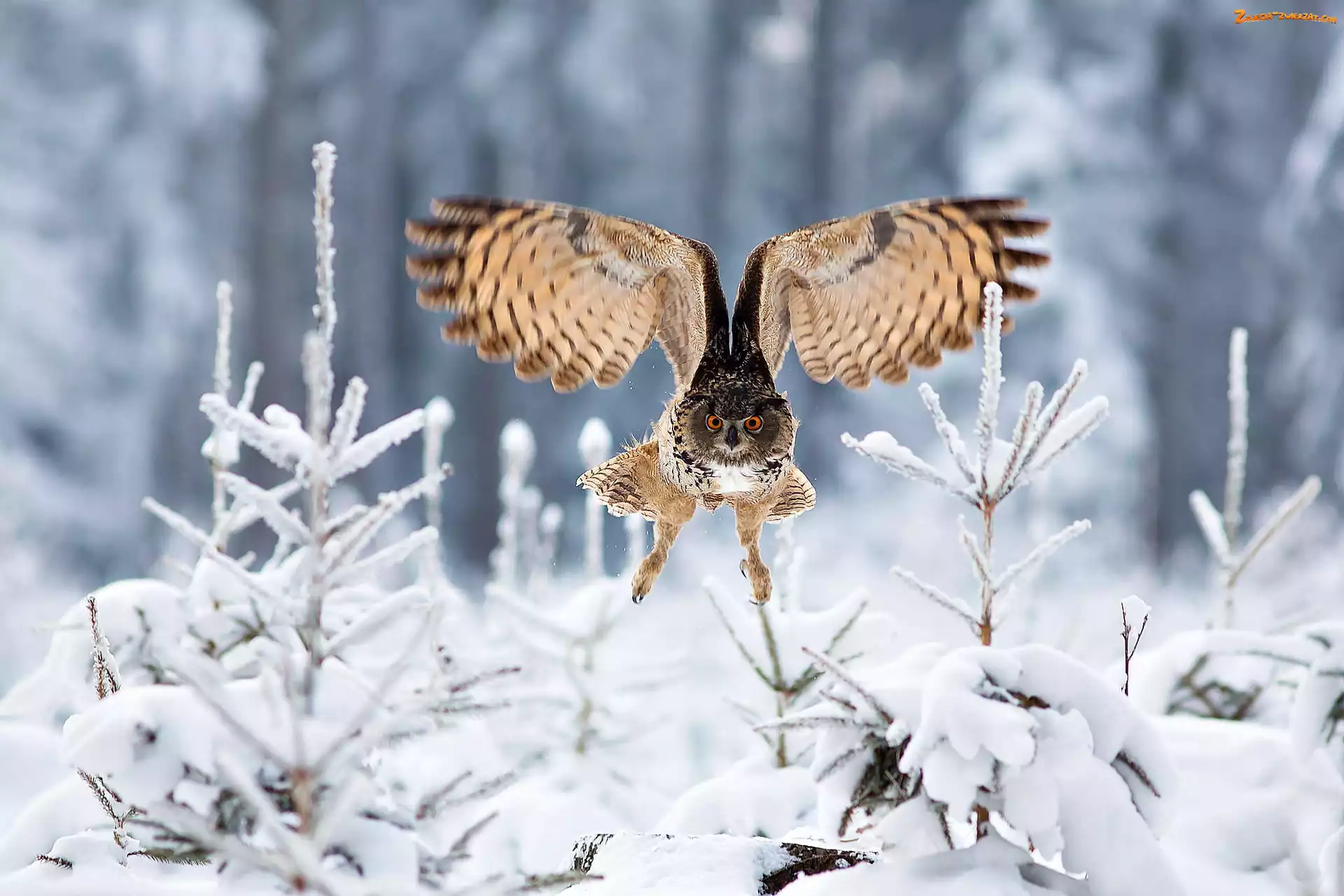 Zdjęcie: Drzewa, Ośnieżone, Sowa, Lecąca, Zima