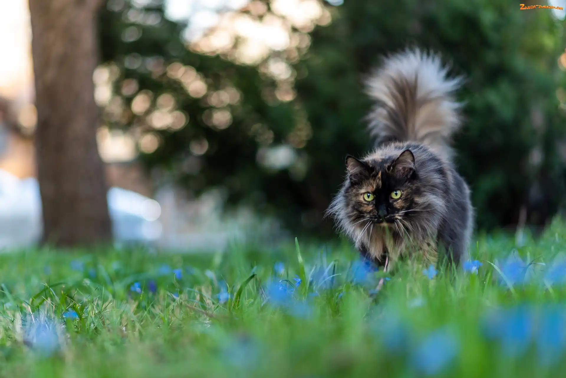 Zdjęcie: Drzewa, Kwiaty, Kot norweski leśny, Trawa
